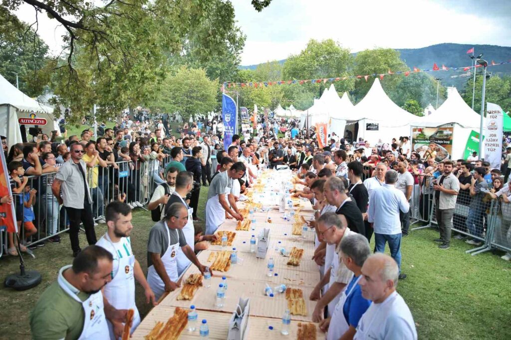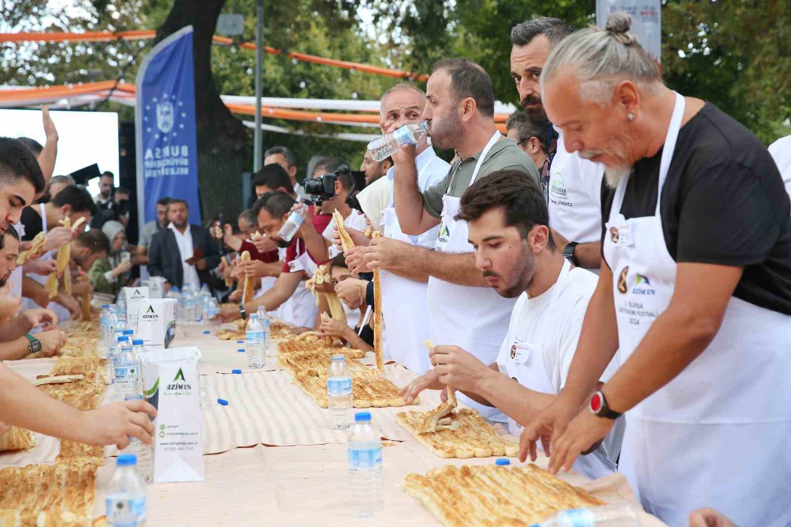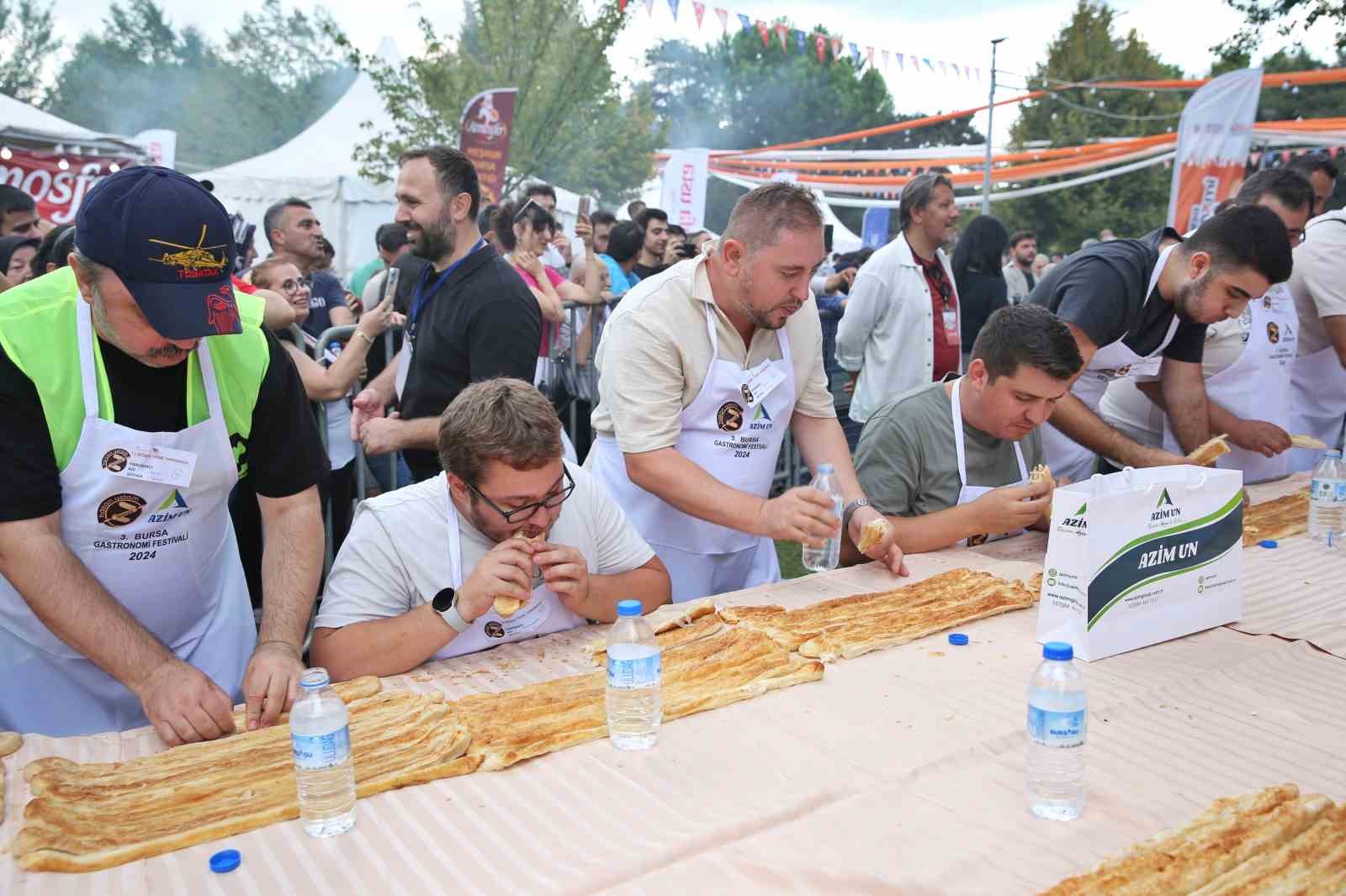 Bursa Büyükşehir Belediyesi tarafından bu yıl 3.’ncüsü düzenlenen Gastronomi Festivali çerçevesinde, en uzun börek yeme yarışması yapıldı. Merinos Atatürk Kongre Kültür Merkezi’nde açık havada yarışmaya katılan vatandaşlara 10 dakika süre tanındı. Kıran kırana geçen yarışmada 10 dakikada ek börek isteyerek 15 metre börek yiyen Ahmet Kılıç birinci oldu. Yarışmada birinci olan Ahmet Kılıç’a 5 gram altın verilirken, ikinci ve üçüncü olanlara çeşitli hediyeler verildi. 52 yarışmacı arasından olan Ahmet Kılıç, “Festival çok eğlenceli geçiyor. Dün baklava yeme yarışmasında 4. oldum. Bugün börek yeme yarışmasında birinciliği aldım. Bunu bekliyordum, daha önceki rekorumu da kırmış oldum. Şampiyon olduğum için mutluyum” diye konuştu.