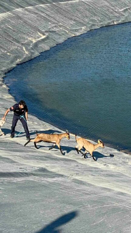 Olay İnegöl’ün Dipsizgöl mahallesindeki sulama göletinde meydana geldi. Gölet kenarından geçen vatandaşlar, gölet içerisinde mahsur kalmış 6 keçi ile köpeği gördüler. Yaklaşık 2 gündür su içinde mahsur kalan küçükbaş hayvan ve köpeğin kurtarılması için vatandaşlar durumu İnegöl İtfaiyesine haber verdiler. Olay yerine sevk edilen itfaiye ekipleri, halatlarla girdikleri gölde mahsur kalan 6 keçi ile köpeği sırayla çıkardılar. Kurtarılan hayvanların 2 gündür gölette mahsur oldukları öğrenildi. Jandarma ekipleri keçilerin kulak küpelerinden sahibine ulaştılar. Deydinler Mahallesi’nden sürüden ayrılarak Dipsizgöle kadar geldikleri öğrenilen keçiler, sahibi Şerafettin Şimşek’e teslim edildiler.