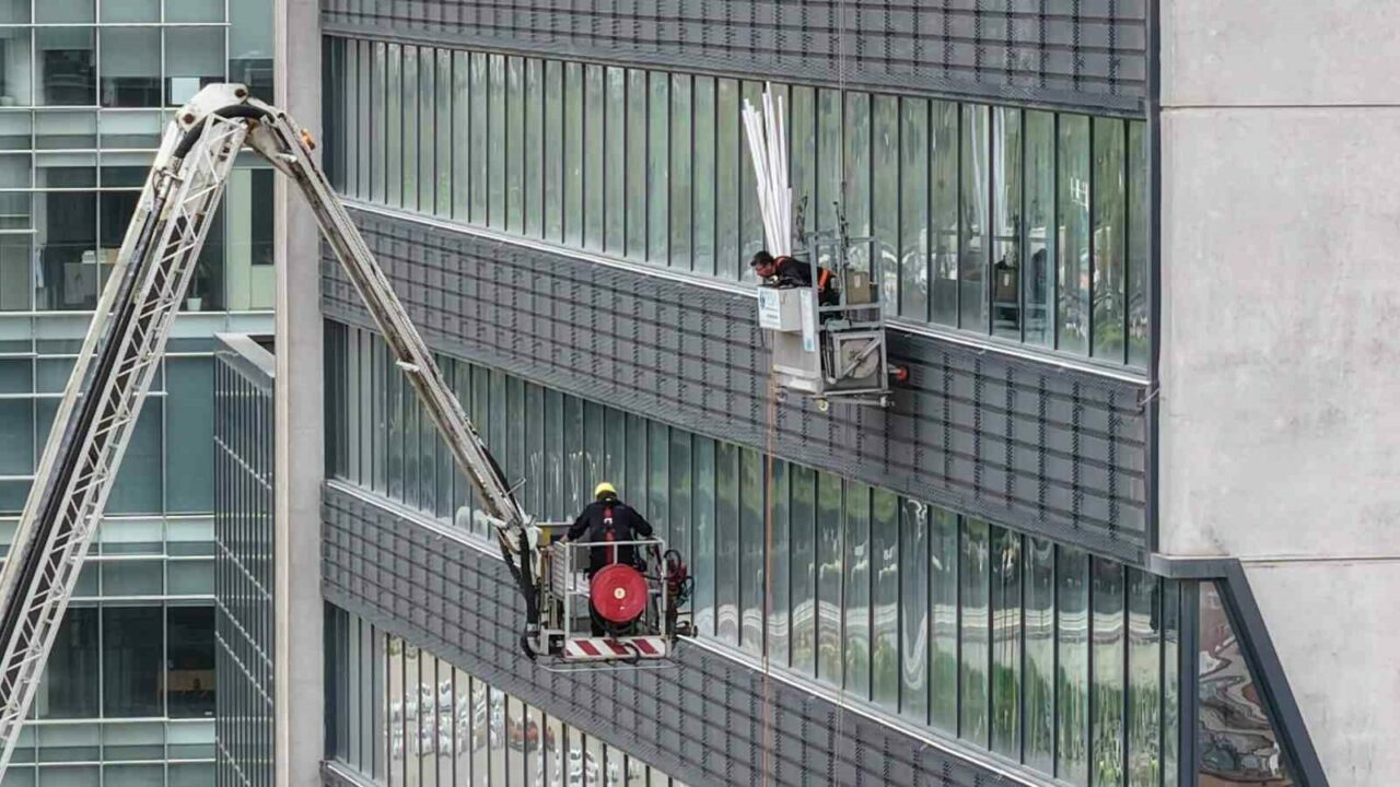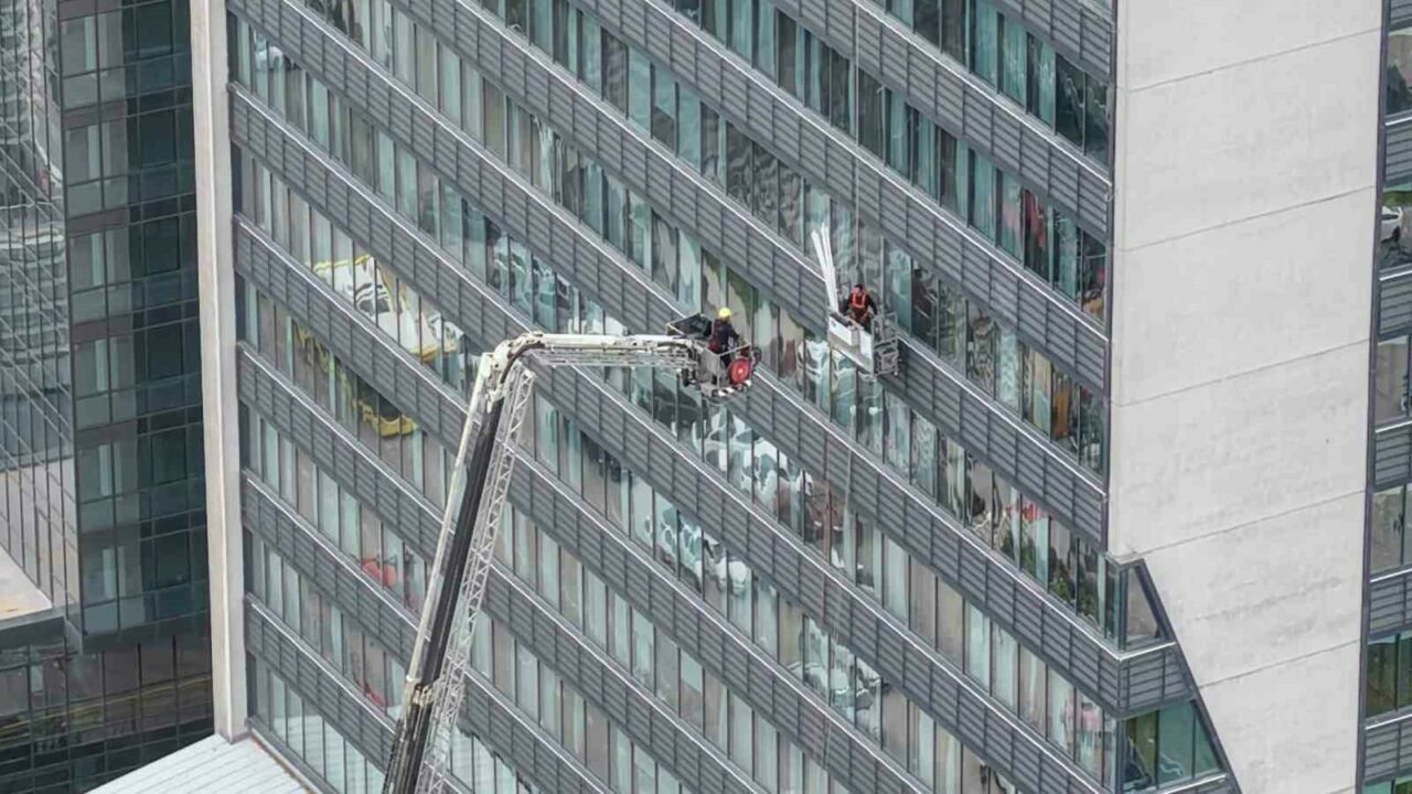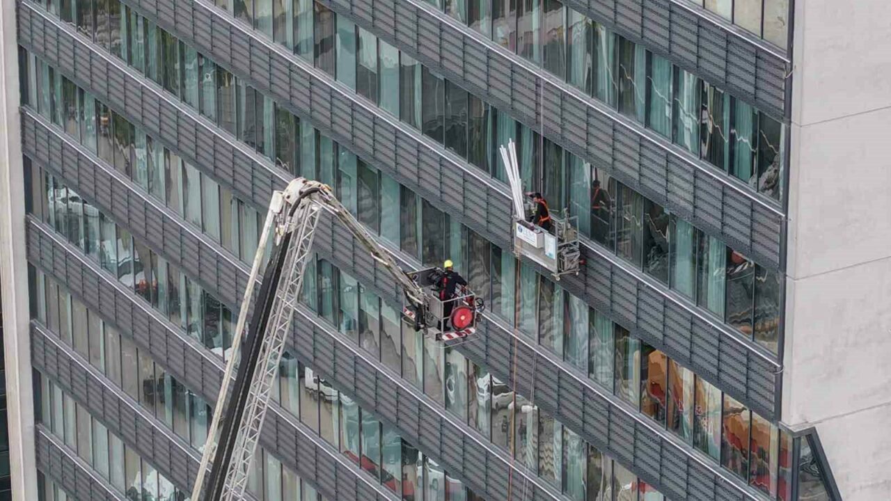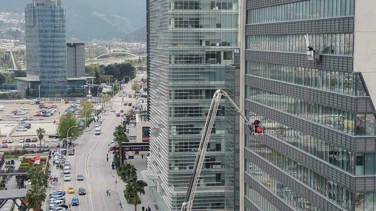 ÖZEL HASTANENİN DIŞ CEPHE CAMLARINI SİLERKEN MAHSUR KALAN İKİ İŞÇİ 52 METRELİK MERDİVENLİ ARAÇLA KURTARILDI