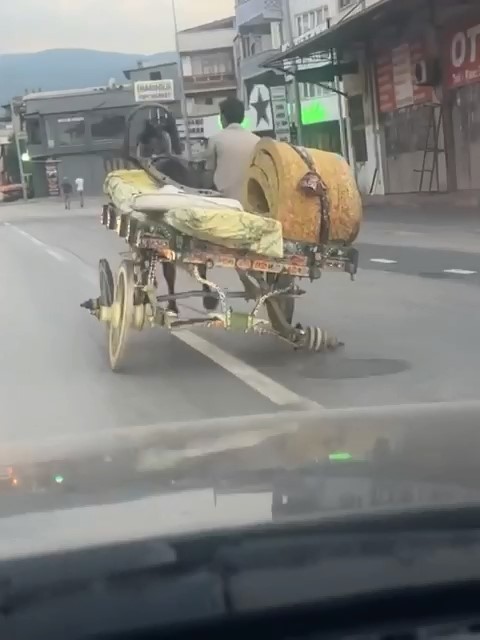 Bursa’da at arabalı şahıs, tekerin kopmasını aldırış etmedi. 3 teker ile ilerleyen şahsı görenler, o anları kayda aldı.