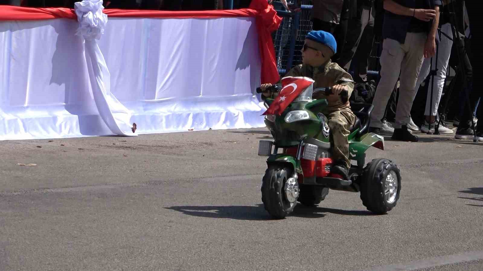 Resmi geçit sırasında akülü motoruna bağladığı çakar sistemiyle askerlerin yanında geçide dahil olan çocuk, geçiş sırasında dikkatleri üzerine çekti. Asker kıyafetli çocuğu gören vatandaşlar, o anları cep telefonlarıyla ölümsüzleştirdi.