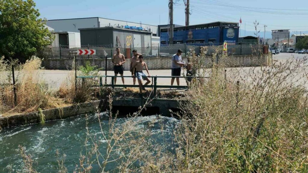 Mustafakemalpaşa’da termometreler 40 dereceyi gösterdi. Artan sıcaklık ve yüksek nemle birlikte hissedilen sıcaklığın daha da yükselmesi, vatandaşları serinlemenin alternatif yollarını aramaya itti. Denize ya da havuza ulaşma imkanı olmayan bazı gençler ise çareyi Fevzidede Mahallesi’ndeki tarımsal sulama kanalında buldu.