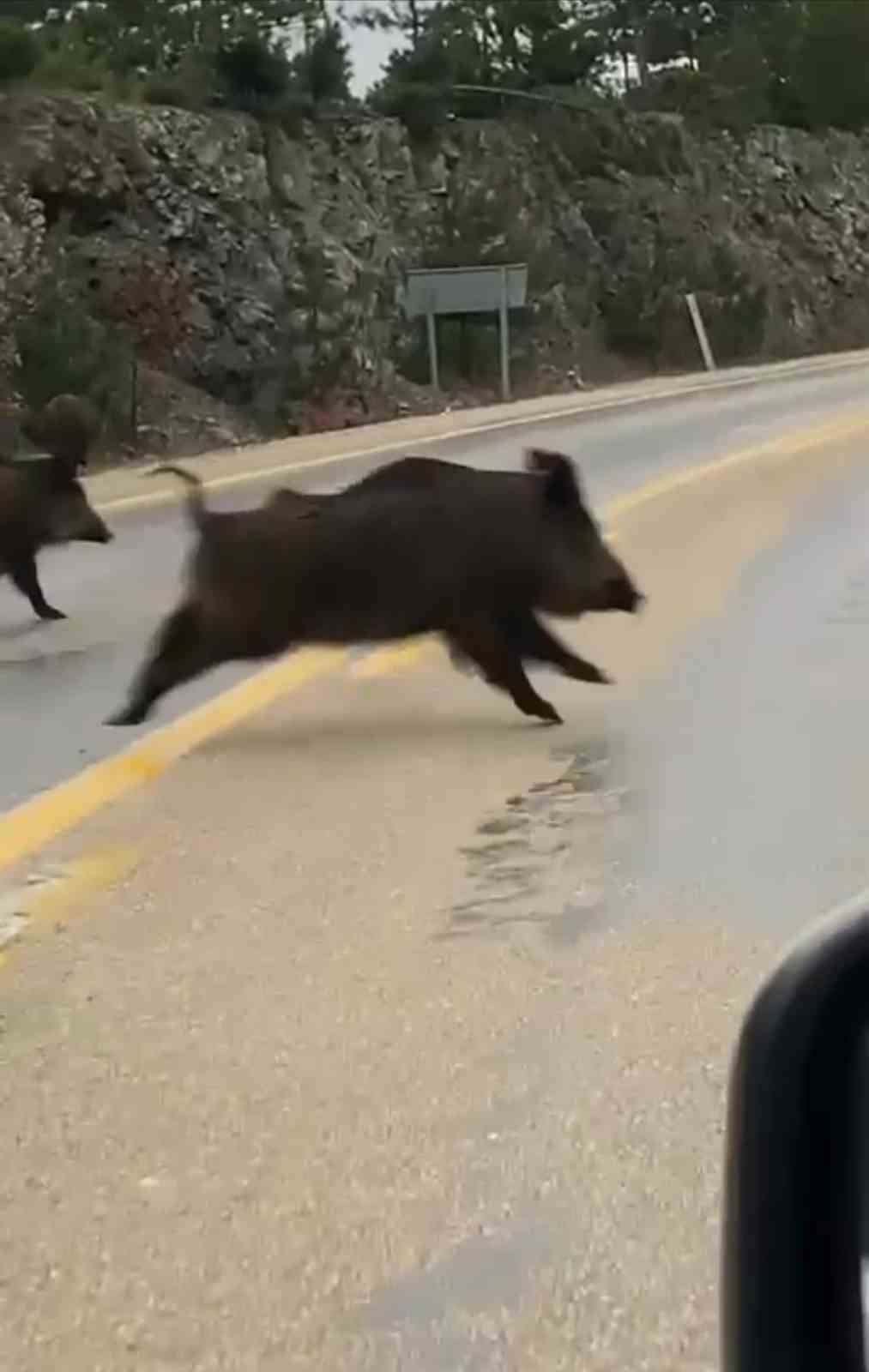 Bursa’da yemek bulamayan domuzlar karayoluna indi.