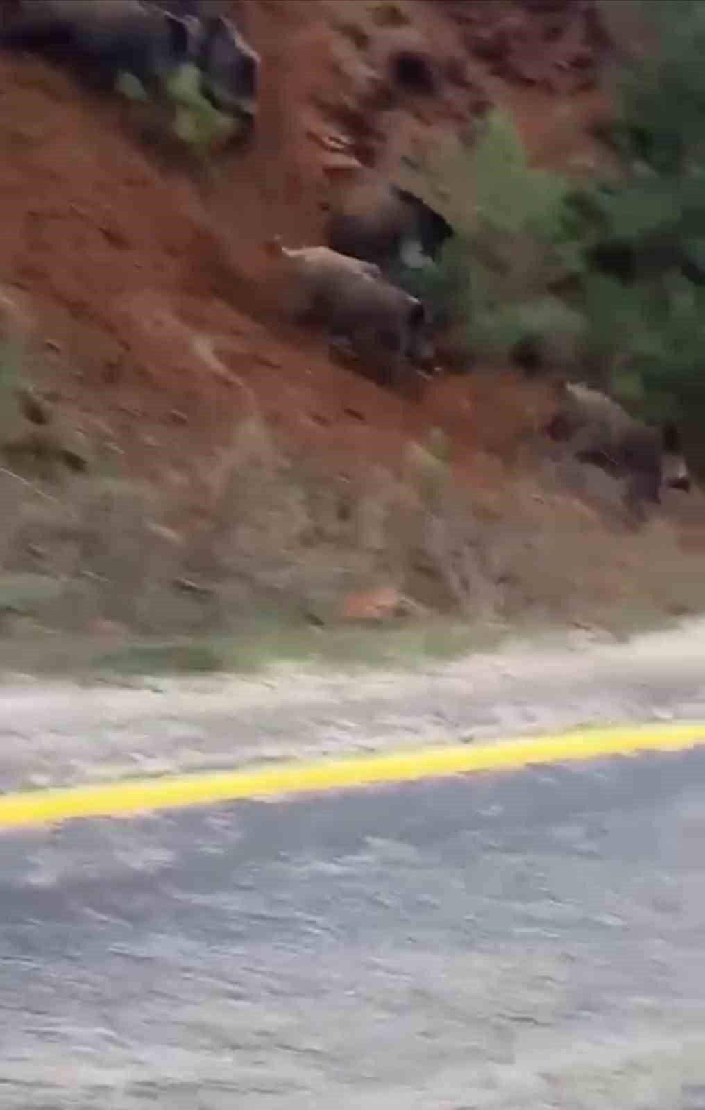 Ormanda yiyecek bulamayan domuz sürüsü Bursa Keles karayoluna inerek yemek aradı. Onlarca domuzu gören sürücüler ise büyük şaşkınlık yaşadı.