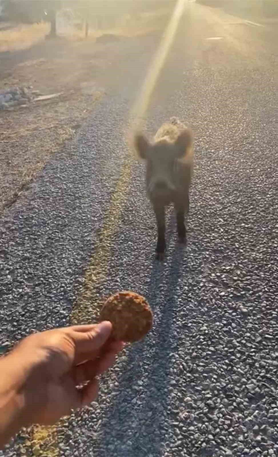 Bursa’da aç kalan domuz sürüsü ilçe merkezine indi. Vatandaşlar domuzları kurabiye ile besledi.