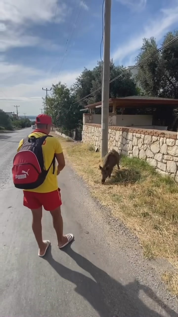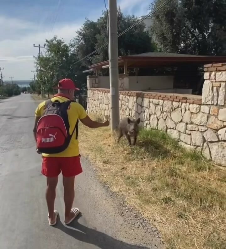 Aç kalarak Mudanya ilçesinde şehir merkezine kadar inen domuzu, bir vatandaş bisküvi ile besledi. Domuz ile sohbet eden vatandaş, o anları kayda aldı. Aç kalan domuz, bisküviyi yiyerek bölgeden uzaklaştı.