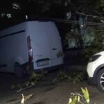 Bursa’da gece saatlerinde etkisini artıran lodos, Kükürtlü Mahallesi’nde bir ağacı ve elektrik direğini araçların üzerine devirdi.