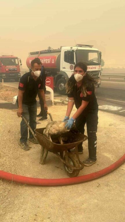 Kamyonlara konulan büyükbaş hayvanlar uzaklaştırıldı. Ayrıca ekipler bir köpeği de alevlerden kurtarıp el arabasıyla uzaklaştırdı.