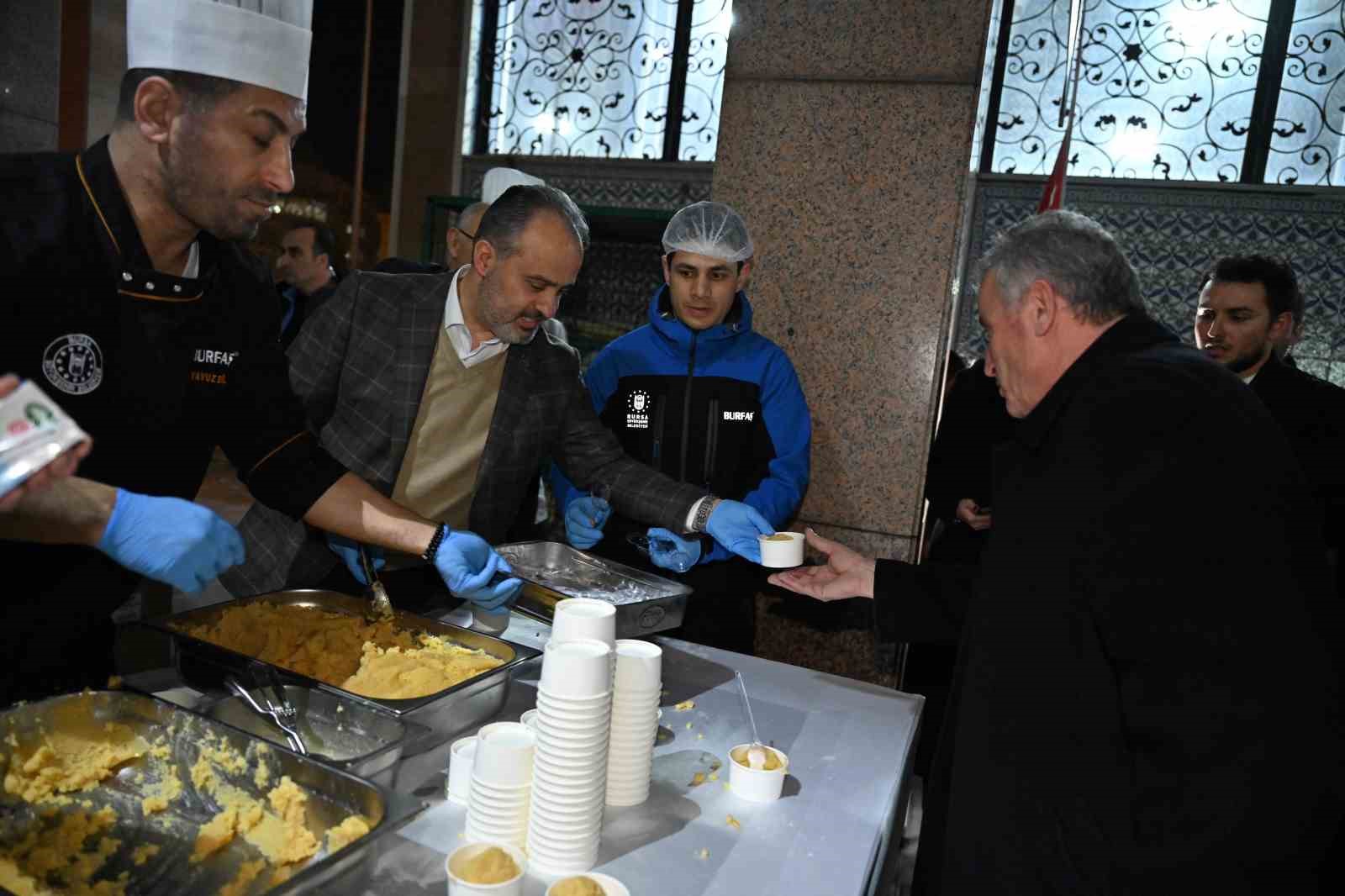 Bursa Büyükşehir Belediyesi Başkanı Alinur Aktaş da kandil dolasıyla Mihraplı Cami’de katıldığı programın ardından vatandaşlara helva ve süt ikramında bulundu.