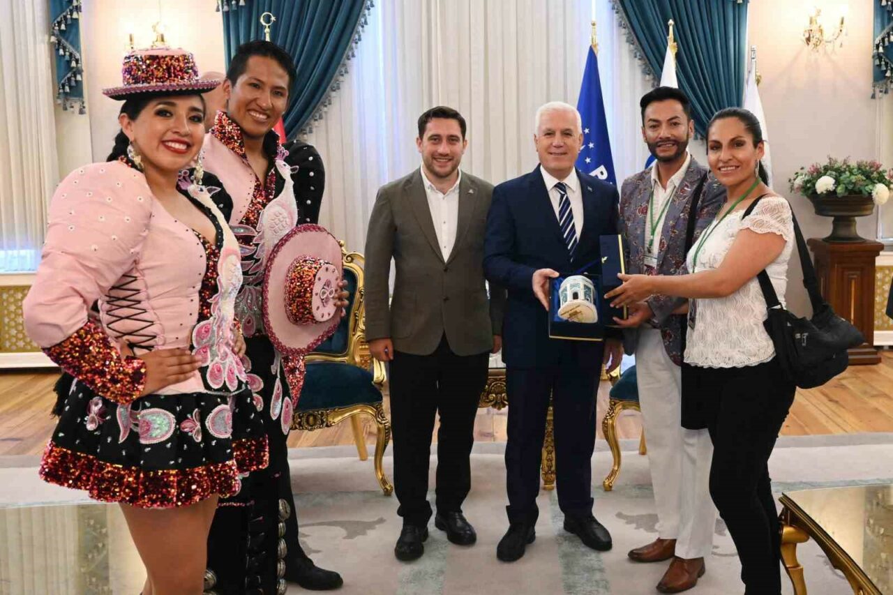 Bursa Büyükşehir Belediyesi tarafından bu yıl 36’ncısı düzenlenen Altın Karagöz Halk Dansları Yarışması’na katılan ekiplerin temsilcileri, Başkan Mustafa Bozbey’i ziyaret ederek ülkelerinin sembol hediyelerini sundu.