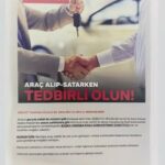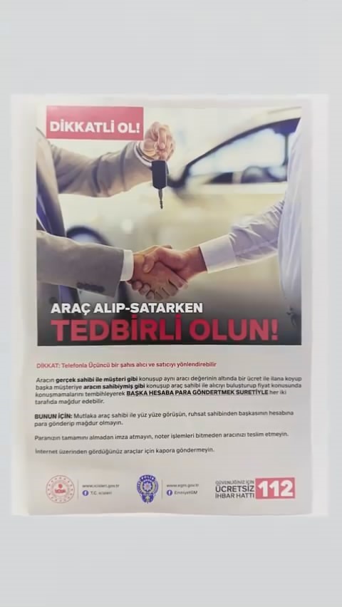 “Çok ucuza buldum demeyin, sazan sarmalı oyununa gelmeyin. Araç satış işlemleri boyunca ruhsatın asıl sahibi haricinde hiçbir kişiyle görüşmeyiniz. Noterdeki araç devri esnasında aracın ücretini arkadaş, akraba ve kuzen olarak tanıtılan üçüncü kişilere göndermeniz isteniyorsa dolandırılıyor olabilirsiniz. Dikkatli olalım ve birikimlerimizi dolandırıcılara kaptırmayalım.”
