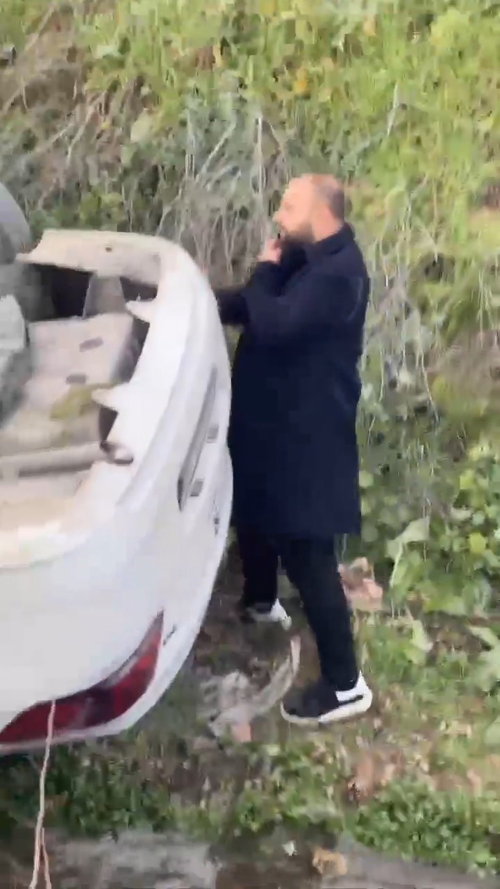 Bursa’da bir otomobil sürücüsü aracıyla dere yatağına uçtu. Ters dönen otomobilden çıkan sürücü o anları “hiçbir şey yokmuş” gibi telefonda anlatırken, arkadaşı o anları gülerek kayda aldı.