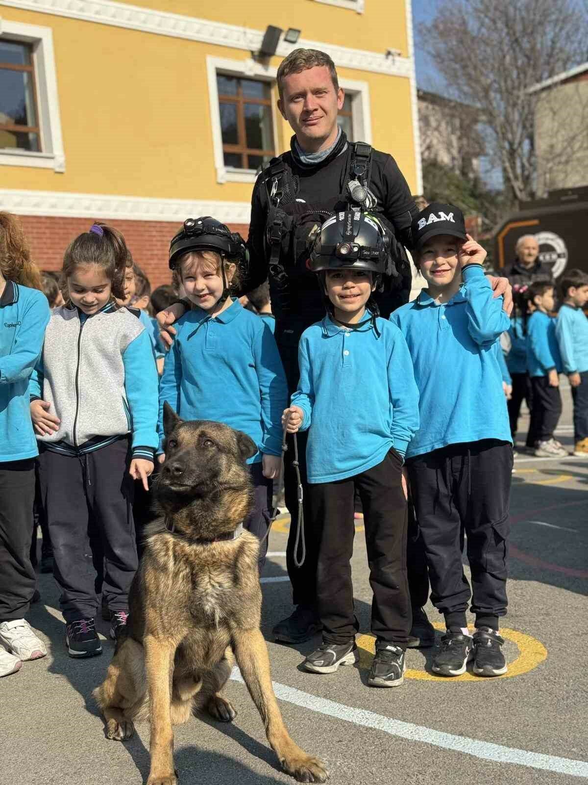 Bursa’da ilkokullarda deprem farkındalık eğitimi ve tatbikatı gerçekleştirildi. Arama kurtarma köpeği Tipo çocukların gözdesi oldu.