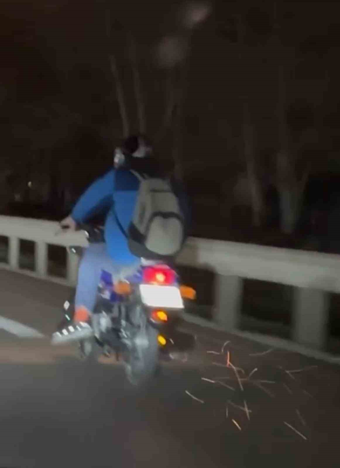 Merkez, Osmangazi ilçesi 11 Eylül Bulvarı mevkiinde bir sürücü, arıza yapan motosikletiyle kilometrelerce seyir etti. İki tekerlekli aracın egzoz kısmından çıkan kıvılcımlar caddede uçuşurken, sürücü hem kendi, hem de başkalarının canını hiçe sayarak ilerlemeye devam etti.