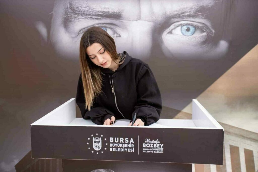 Mustafa Kemal Atatürk’ün aramızdan ayrılışının 87. yıl dönümünde Bursa’da kalpler ve kalemler, Büyükşehir Belediyesi’nin projesi ile bir araya geliyor. Bursalılar, Ata’ya duydukları özlem ve sevgilerini Büyükşehir Belediyesi’nin kentin farklı noktalarına kurduğu anı defteri stantlarıyla satırlara döküyor.