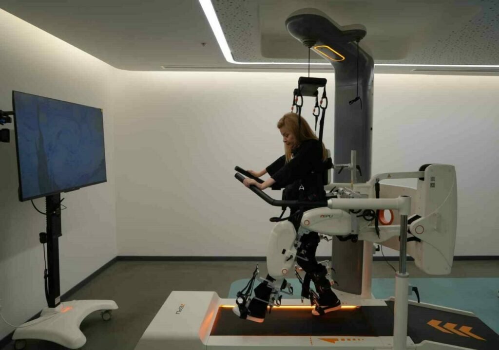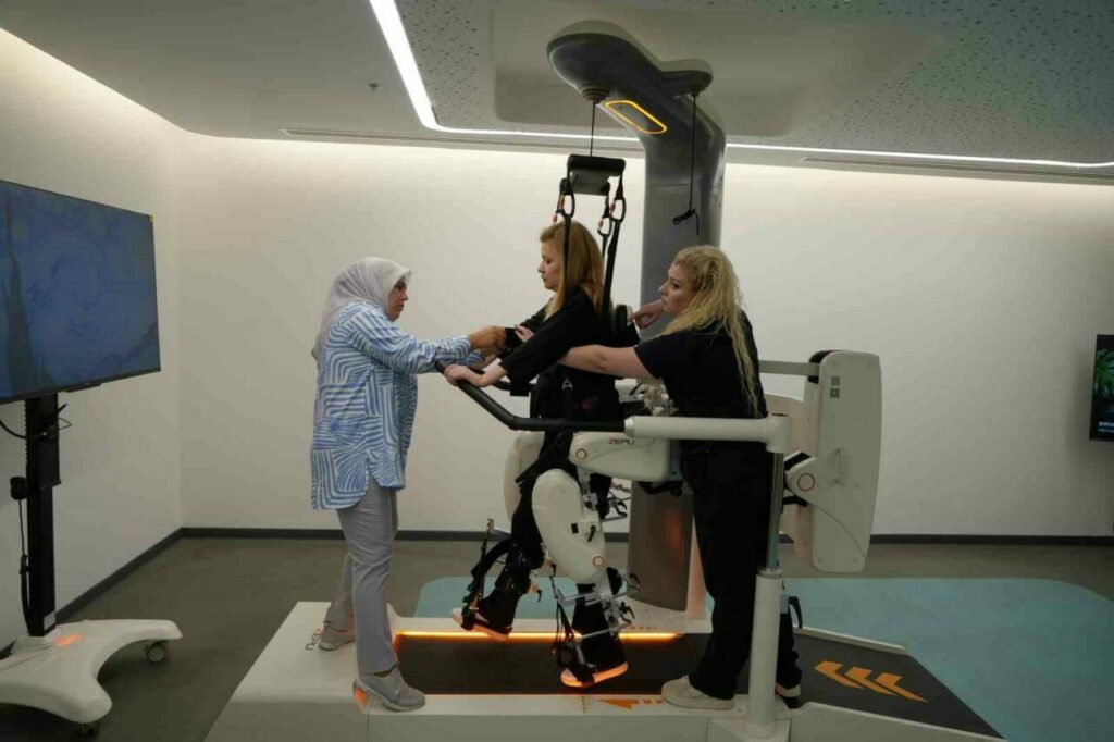 Yürümeye yardımcı robot ile yapay zeka destekli simülasyona bakarak yürüyüş yapan Karaburun, simülasyondaki yürüyüş yapan kız çocuğunun kendisine benzediğini bu sebeple bu simülasyonu tercih ettiğini söyledi.