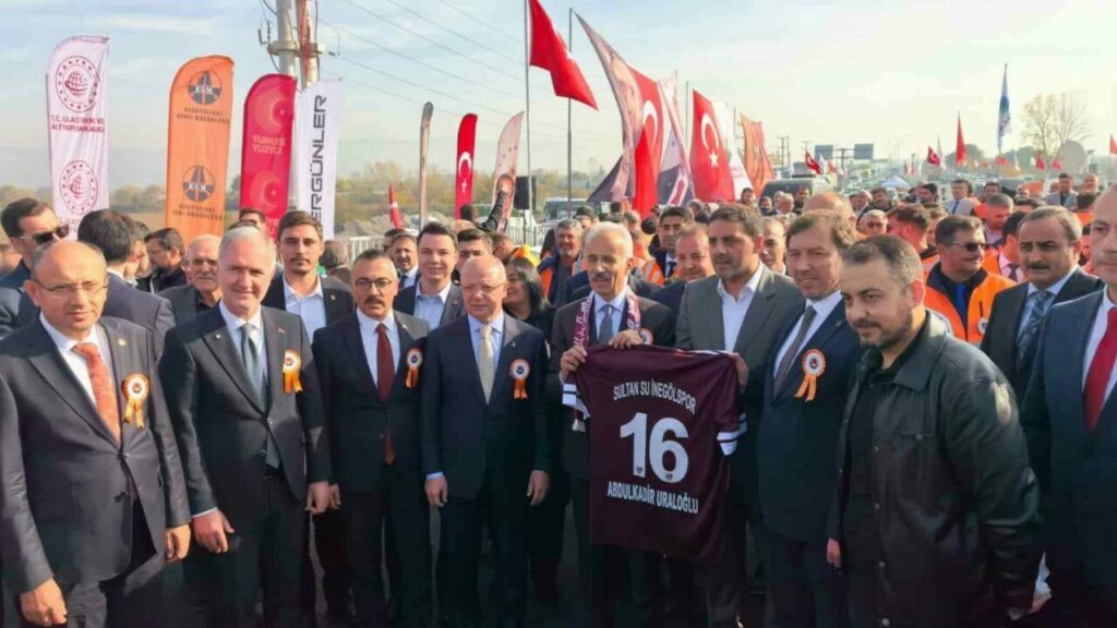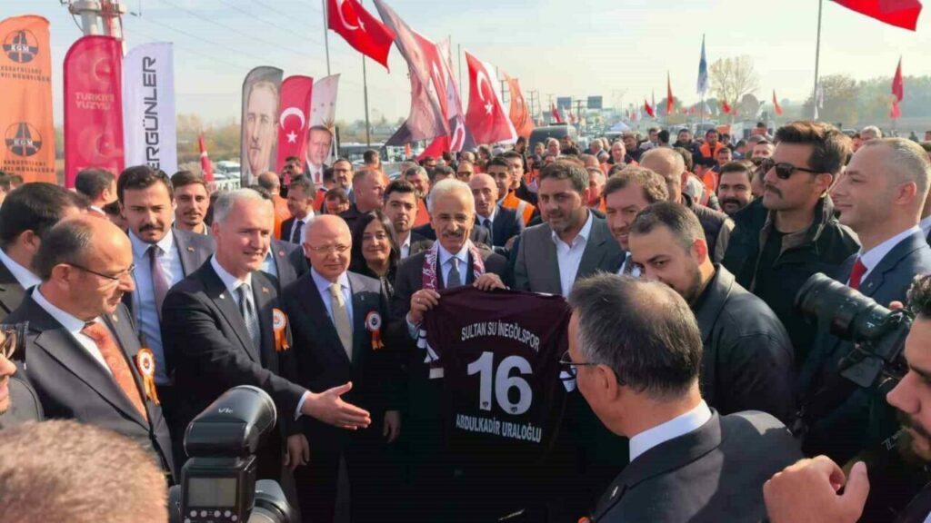 Bakan Uraloğlu, “Siz üretmeye devam edin, biz yolunuzu açmaya devam edeceğiz diyoruz ve bunu da hayata geçiriyoruz. İnegöl giriş kavşağı işte bu sözün tam da nişanesidir. Konuşma metninde yoktu öğleden sonraki programa ayırdım ama burada da İnegöllü kardeşlerimle paylaşayım. Biz İnşallah önümüzdeki yıl Bursa’mıza yüksek hızlı trenle seyahat edeceğiz. 2026 yılında biz Bursa’ya yaptığımız gezilerden bir tanesini inşallah Ankara’dan İstanbul’dan hızlı trenle yapmış olacağız, projeyi yakından takip ediyoruz. Nazar etme ne olur, çalış senin de olur diyoruz ya onun için de bazen muhalif kardeşlerimizde onların haklı eleştirilerinin başımızın üzerinde yeri vardır. Ama bu anlamda onların da eleştirdiği bu konuları biz İnşallah hayata geçirmiş olacağız” diye konuştu.