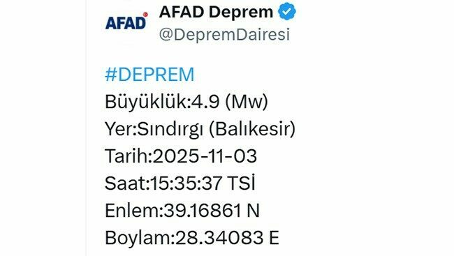Afet ve Acil Durum Yönetimi Başkanlığı (AFAD), bugün saat 15.35’te Balıkesir’in Sındırgı ilçesinde 4.9 büyüklüğünde bir deprem meydana geldiğini duyurdu. Depremin 11.02 kilometre derinlikte gerçekleştiği bildirildi.
