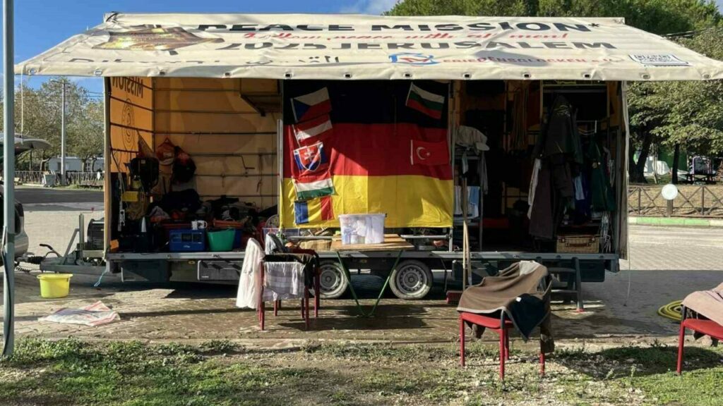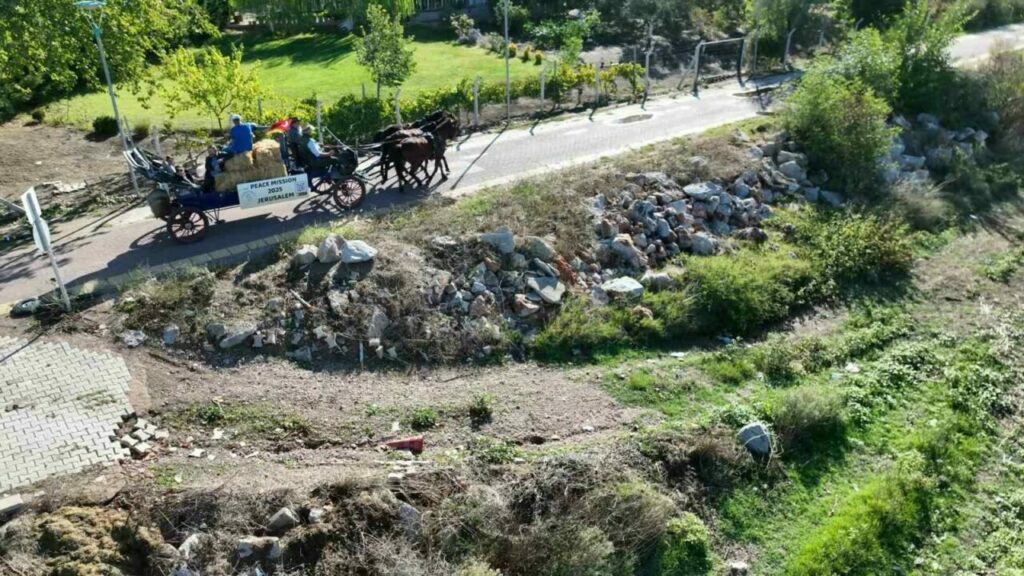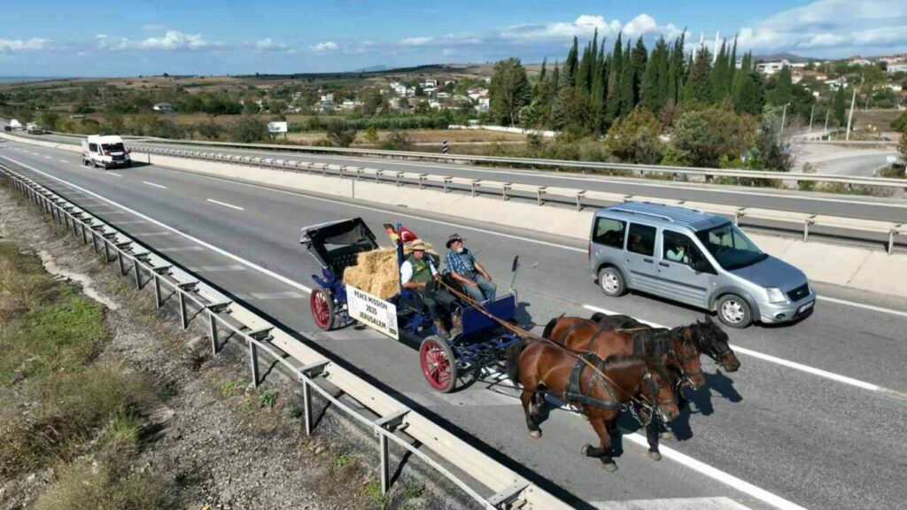 Alman Friedensglocken (Barış Çanları) derneğinin üyeleri, ’Peace Mission Jerusalem’ parolasıyla yolan çıktıkları yolun 2 bin 300 kilometresini geride bıraktı. Mayıs ayında Berlin’de görkemli bir kutlamayla yola çıkan ekip, Aralık ayının 25’inde Kudüs’te olmayı hedefliyor. Başta İsrail’in Filistin’e karşı yaptığı zulme dikkat çekmek için başlattıkları atlı barış yürüyüşünde bir çok zorlukla da karşı karşıya kaldı. Türkiye’ye gelen aktivitler, Bursa’da mola verdi. Sabahın ilk ışıklarıyla yine yola koyulan ekip, at arabalarında yer alan ve İkinci Dünya Savaşı’ndan kalma askeri hurdadan dökülmüş çandaki ’Herkesle barışı kovalayın’ yazısıyla dikkat çekiyor.