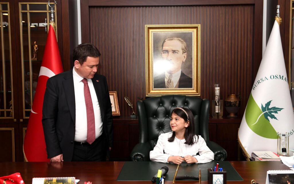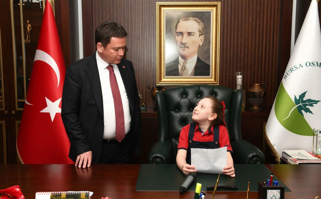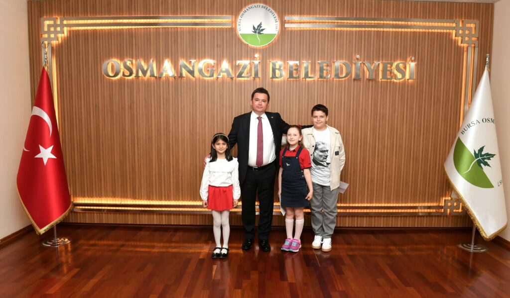 Osmangazi Belediye Başkanı Erkan Aydın, 23 Nisan Ulusal Egemenlik ve Çocuk Bayramı dolayısıyla makam koltuğunu temsili olarak çocuklara devretti. Başkanlık koltuğuna oturan küçük öğrenciler, insanlara, hayvanlara, kente ve doğa dair yapmayı planladıkları projelerini anlattı.