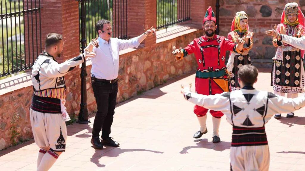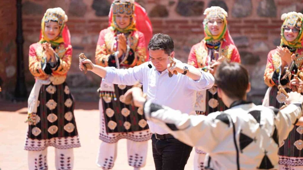 Başkan Aydın, Osmangazi Belediyesi’nin Halk Dansları Topluluğu ile birlikte Bursa’nın en sevilen halk oyunlarından Küçük Oyun (Aşağıdan)’a eşlik ederek programa renk kattı.