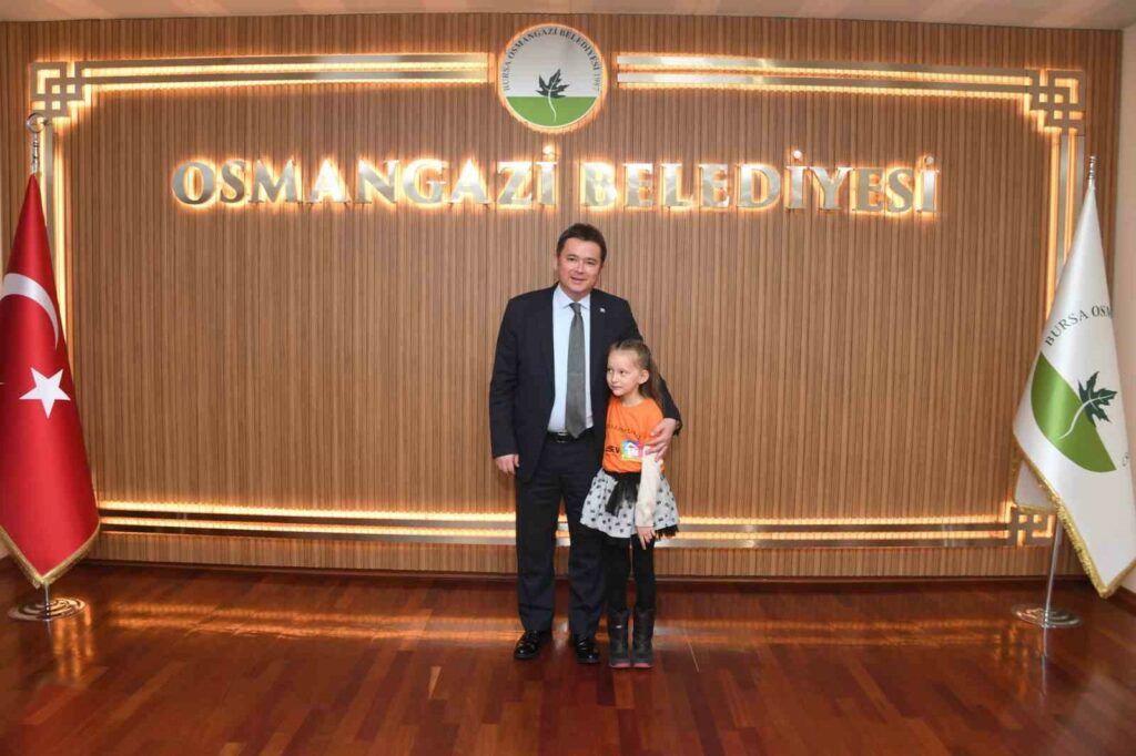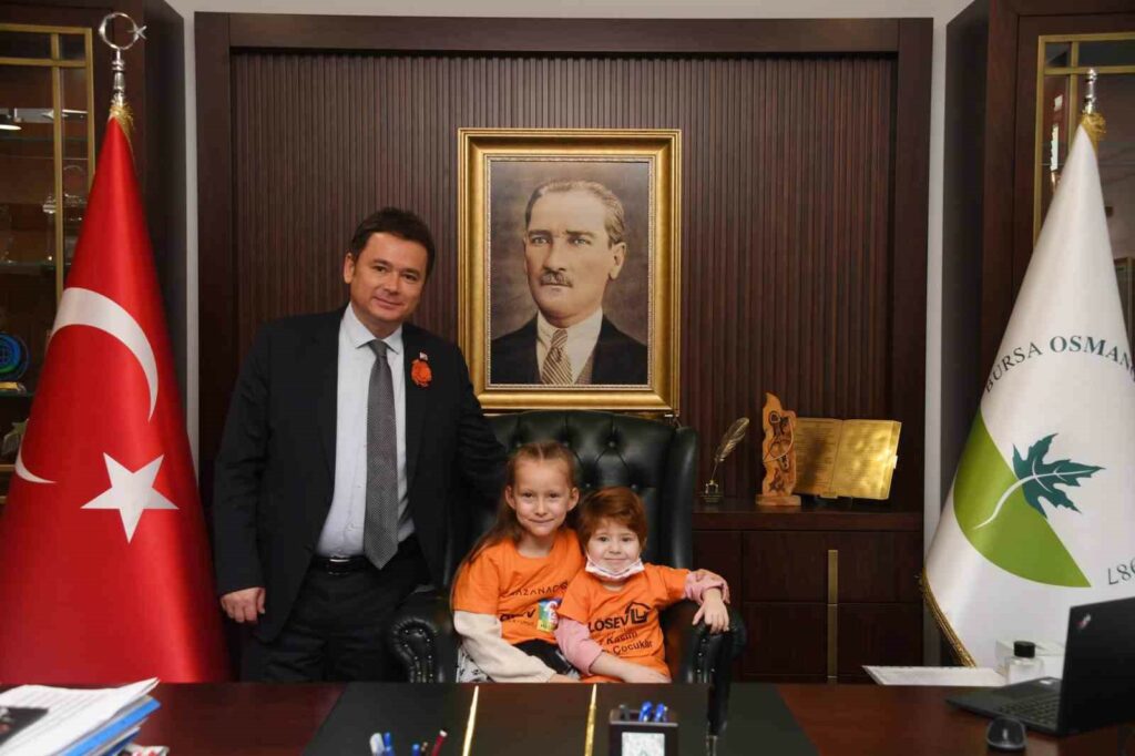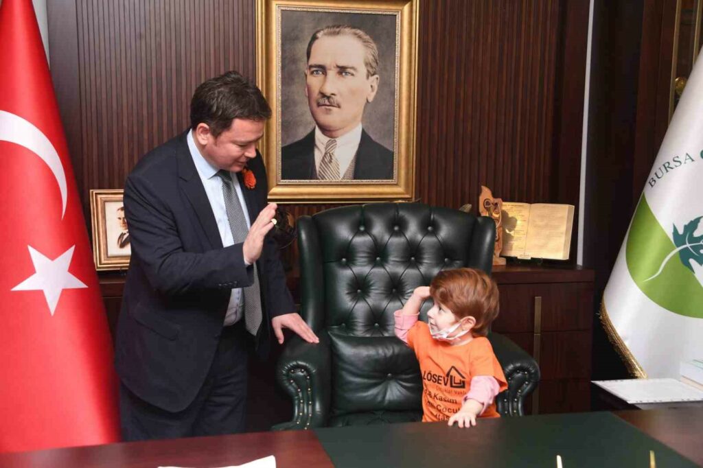 Osmangazi Belediye Başkanı Erkan Aydın, 2-8 Kasım Lösemili Çocuklar Haftası kapsamında iki özel misafirini ağırladı. Başkanlık koltuğunu küçük konuklarına bırakan Başkan Aydın, ‘Lösemi ile mücadele eden çocuklarımızın sağlığına kavuşması için elimizden ne geliyorsa yapmaya hazırız” dedi.
