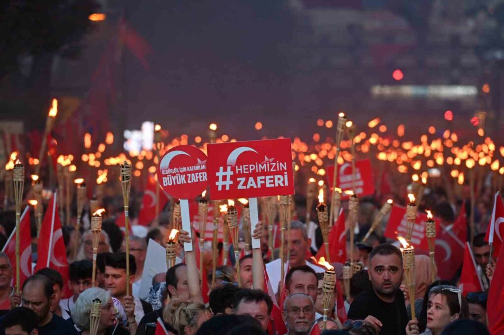 30 Ağustos Zafer Bayramı’nın 102’inci yıldönümü, tüm yurtta olduğu gibi Bursa’da da büyük bir coşkuyla kutlandı. Gündüz etkinlerinin ardından binlerce Bursalı, Bursa Büyükşehir Belediyesi tarafından ‘Hepimizin Zaferi’ sloganıyla düzenlenen fener alayı yürüyüşüne katılmak üzere Tarihi Belediye Binası önünde toplandı. Yürüyüşe Bursa Büyükşehir Belediye Başkanı Mustafa Bozbey ve eşi Seden Bozbey’in yanı sıra Bursa Milletvekilleri Hasan Öztürk, Kayıhan Pala, Orhan Sarıbal, CHP İl Başkanı Nihat Yeşiltaş, Bursa Kent Konseyi Başkanı Prof. Dr. Ertuğrul Aksoy, ilçe belediye başkanları, Büyükşehir Belediyesi genel sekreter yardımcıları, daire başkanları ve bürokratları da katıldı. Atatürk Caddesi’ni baştan sona dolduran binlerce kişi, ellerindeki fenerler ve Türk bayrakları ile 30 Ağustos Zafer Bayramı coşkusunu yaşamak için Altıparmak Atatürk Stadyumu alanına kadar marşlar eşliğinde yürüdü. Ellerindeki fener ve pankartlarla omuz omuza yürüyen binlerce kişi, Bursa’da uzun yıllardır görülmemiş bir manzaraya imza attı.