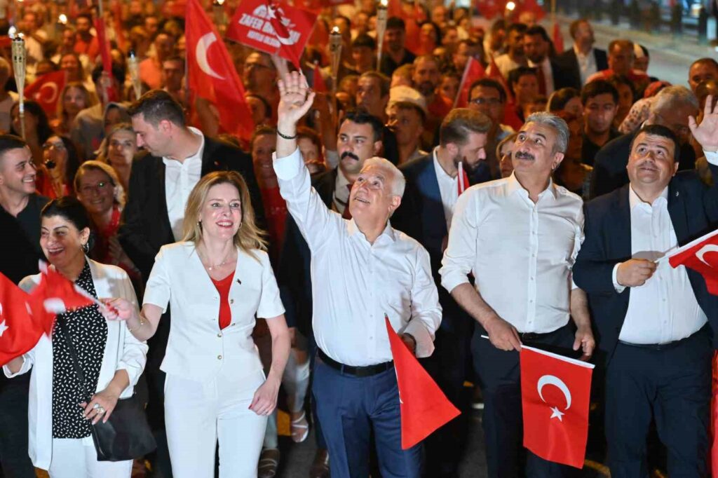 30 Ağustos Zafer Bayramı’nın 102’inci yıldönümü, tüm yurtta olduğu gibi Bursa’da da büyük bir coşkuyla kutlandı. Gündüz etkinlerinin ardından binlerce Bursalı, Bursa Büyükşehir Belediyesi tarafından ‘Hepimizin Zaferi’ sloganıyla düzenlenen fener alayı yürüyüşüne katılmak üzere Tarihi Belediye Binası önünde toplandı. Yürüyüşe Bursa Büyükşehir Belediye Başkanı Mustafa Bozbey ve eşi Seden Bozbey’in yanı sıra Bursa Milletvekilleri Hasan Öztürk, Kayıhan Pala, Orhan Sarıbal, CHP İl Başkanı Nihat Yeşiltaş, Bursa Kent Konseyi Başkanı Prof. Dr. Ertuğrul Aksoy, ilçe belediye başkanları, Büyükşehir Belediyesi genel sekreter yardımcıları, daire başkanları ve bürokratları da katıldı. Atatürk Caddesi’ni baştan sona dolduran binlerce kişi, ellerindeki fenerler ve Türk bayrakları ile 30 Ağustos Zafer Bayramı coşkusunu yaşamak için Altıparmak Atatürk Stadyumu alanına kadar marşlar eşliğinde yürüdü. Ellerindeki fener ve pankartlarla omuz omuza yürüyen binlerce kişi, Bursa’da uzun yıllardır görülmemiş bir manzaraya imza attı.