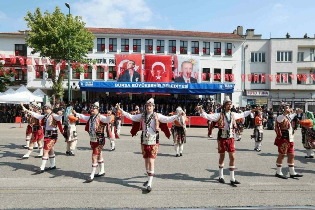 Selamlama sonrası İstiklal Marşı’nın okunmasının ardından Bursa Erkek Lisesi öğrencileri Ege Ayberk Men ve Tuana Naz Muşlu tarafından şiir okundu. Daha sonra Yıldırım, Nilüfer ve Osmangazi Belediyesi Halk Oyunları ekipleri gösterilerini sundu. Askeri Veteriner Okulu Eğitim Merkez Komutanlığı ve Garnizon Komutanlığı adına günün anlam ve önemini belirten konuşma yapılmasının ardından Bursa Mehteren Takımı ve Tahtakıran Kılıç Kalkan Halk Oyunları Derneği ekipleri sahne aldı. Program resmi geçitle devam etti. Ellerindeki bayraklarla törenlere eşlik eden Bursalılar, 30 Ağustos Zafer Bayramı coşkusunu birlikte yaşadı.
