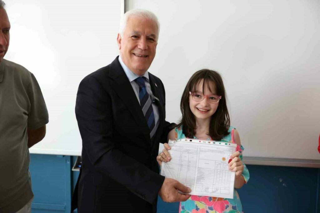Öğrencilerle sohbet eden ve karnelerini veren Başkan Mustafa Bozbey, velilere de tavsiyelerde bulunarak notlar ne olursa olsun çocuklarının yanlarında olmalarını tavsiye etti. Karne alan tüm öğrencileri ve ailelerini tebrik eden Başkan Mustafa Bozbey, özel okullarda eğitim alan çocuklarla bilgilerini paylaşan öğretmenlere de teşekkür etti. Eğitim öğretim döneminin ardından tüm çocukların tatili hak ettiğini söyleyen Başkan Mustafa Bozbey, yaz aylarını bol bol kitap okuyarak değerlendirmelerini de tavsiye etti. Ailelerin de çocuklarını Büyükşehir Belediyesi Yaz Okulları’na göndererek kaliteli vakit geçirmelerini sağlamalarını isteyen Başkan Bozbey, “Çocuklarımıza eğitim veren, her anlamda gelişmeleri için çabalayan öğretmenlerimize teşekkür ediyorum. Öğrencilerimiz yoğun geçen bir eğitim öğretim döneminin ardından tatili hak ettiler. Hepsini tebrik ediyorum. Çocuklarımız, Bursa Büyükşehir Belediyesi Yaz Okulları’na giderek tatillerini eğlenceli ve verimli geçirebilir. Büyükşehir Belediyesi olarak; çocuklarımızın daha nitelikli bir eğitimle, güvenle ve sevgiyle büyümesi için tüm imkânlarımızla yanlarında olmaya, onları her adımlarında desteklemeye devam edeceğiz. Tüm öğrencilere iyi tatiller diliyorum” dedi.