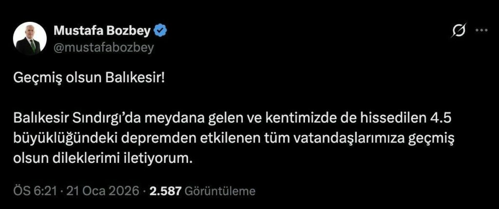 Bursa Büyükşehir Belediye Başkanı Mustafa Bozbey, “Balıkesir Sındırgı’da meydana gelen ve Bursa’da da hissedilen 4.5 büyüklüğündeki depremden etkilenen tüm vatandaşlarımıza geçmiş olsun. Gelişmeleri yakından takip ediyoruz” dedi. Balıkesir’in Sındırgı ilçesinde meydana gelen 4.5 büyüklüğündeki deprem, Bursa’da da hissedildi. Kısa süreli paniğe yol açan sarsıntının ardından Bursa Büyükşehir Belediye Başkanı Mustafa Bozbey, sosyal medya hesabından açıklamada […]