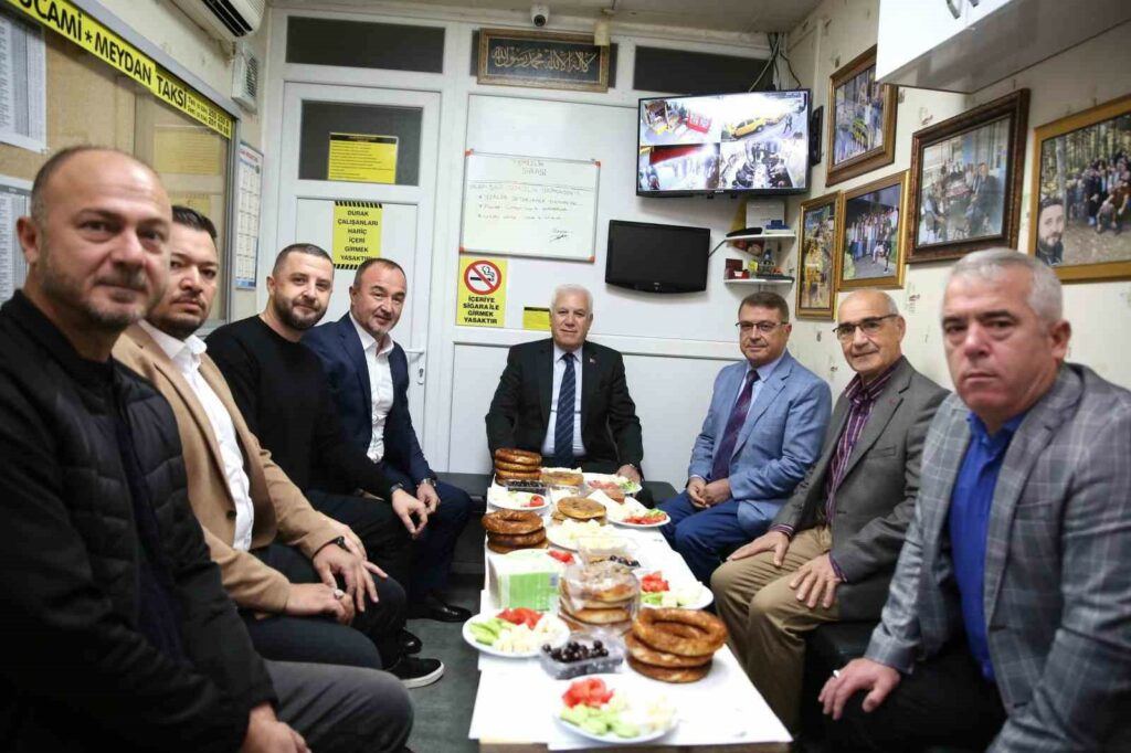 Bursa Büyükşehir Belediye Başkanı Mustafa Bozbey, Uluyol’daki Ulucami Meydan Taksi durağını ziyaret ederek taksici esnafıyla sabah kahvaltısında bir araya geldi. Bursa Esnaf ve Sanatkar Odaları Birliği (BESOB) Başkanı Fahrettin Bilgit, BESOB Başkan Vekili Bahattin Korkmaz ve Bursa Şoförler Odası Başkanı Ahmet Çakır’ın hazır bulunduğu ziyarette, Başkan Bozbey samimi bir ortamda esnafın talep ve önerilerini dinledi. Taksici esnafının sorunlarını yakından bildiklerini söyleyen Başkan Mustafa Bozbey, ekonomideki olumsuz gidişatın da taksici esnafını zor durumda bıraktığını belirtti. Tüm sorunları hep birlikte aşmak için çaba harcadıklarını anlatan Başkan Bozbey, “Taksicilerin kent içinde düzenlenmesini istedikleri talepler vardı. Onları da değerlendirmeye aldık. Taksicimizin yüzünün gülmesi için ne gerekiyorsa yapıyoruz, yapmaya devam edeceğiz” dedi.