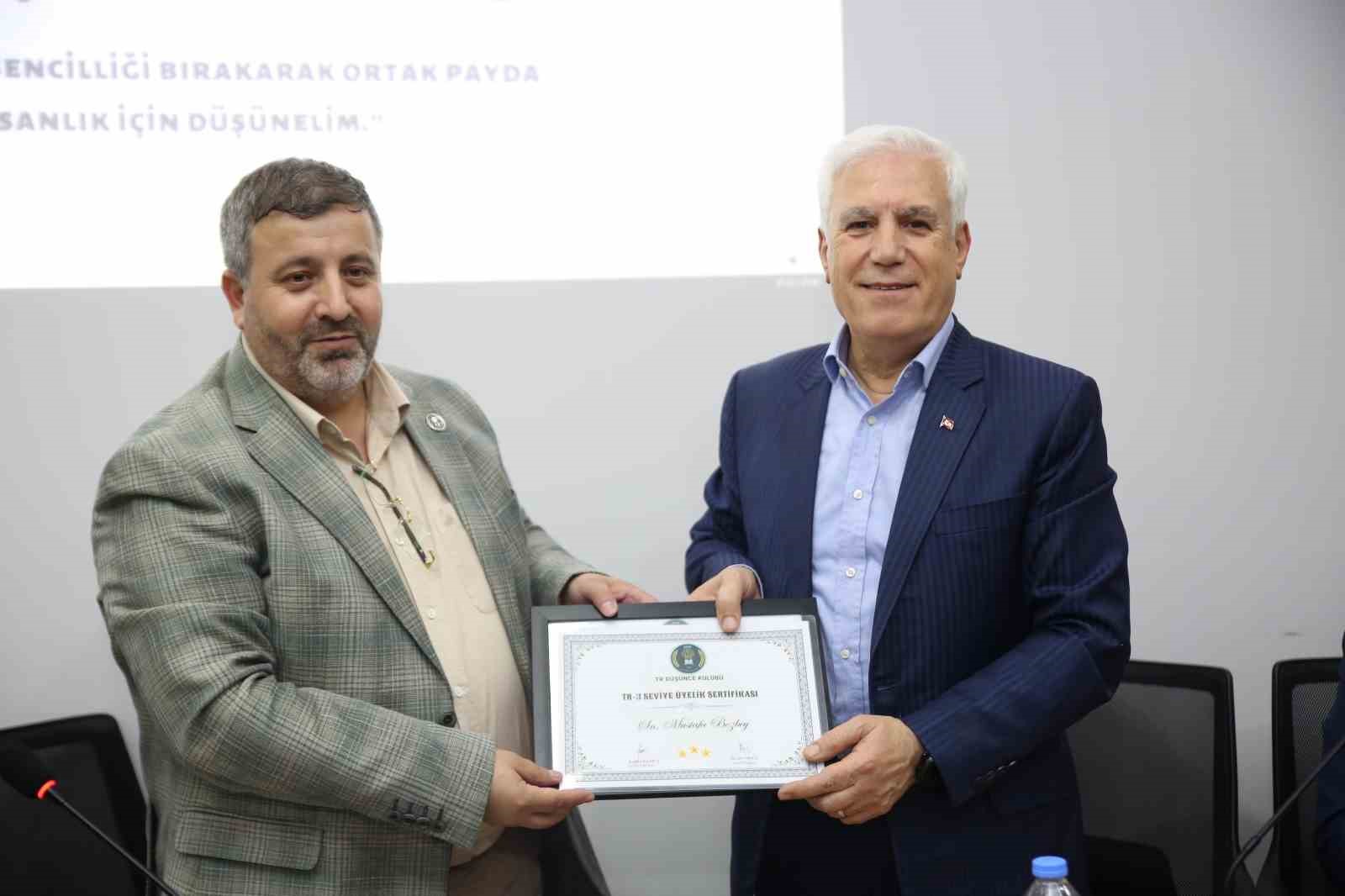 Konuşmaların ardından misafirperverliklerinden dolayı TR Düşünce Kulübü Başkanı Yakut’a teşekkürlerini sunan Bozbey, kulüp yönetimi tarafından kendi adına hatıra ormanında dikilen fidan plaketinin yanı sıra üyelik plaketini de alırken, “Biz de mazbatamızı aldıktan sonra 100 ağaç dikeceğiz” dedi.