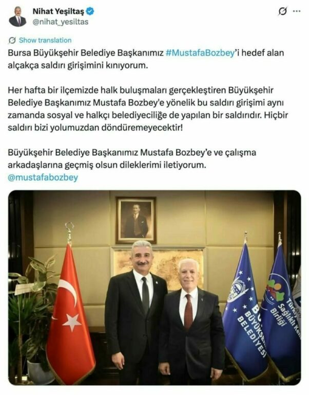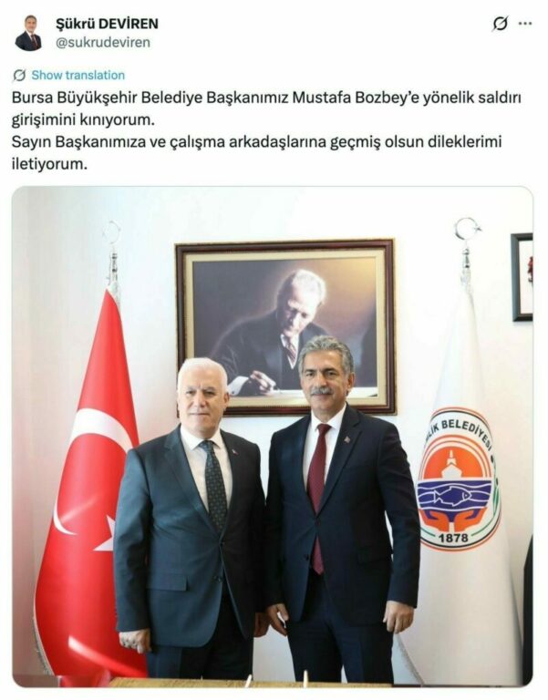 CHP Bursa İl Başkanı Nihat Yeşiltaş ise açıklamasında, “Bursa Büyükşehir Belediye Başkanımız Mustafa Bozbey’i hedef alan alçakça saldırı girişimini kınıyorum. Her hafta bir ilçede halk buluşmaları yapan Başkanımıza yönelik bu girişim, aynı zamanda sosyal ve halkçı belediyeciliğe yönelmiş bir saldırıdır. Hiçbir saldırı bizi yolumuzdan döndüremez. Başkanımıza ve ekibine geçmiş olsun dileklerimi iletiyorum” ifadelerine yer verdi.