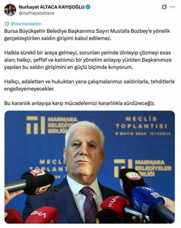 CHP Bursa Milletvekili Nurhayat Altaca Kayışoğlu da saldırı girişiminin kabul edilemez olduğunu belirterek, “Halkla iç içe olmayı, sorunları yerinde dinlemeyi ve çözmeyi esas alan, halkçı ve katılımcı bir anlayışla görev yapan Başkanımıza yönelik bu saldırıyı en güçlü şekilde kınıyorum. Halktan, adaletten ve hukuktan yana yürüttüğümüz mücadele saldırılarla engellenemez. Bu karanlık anlayışa karşı kararlılıkla yolumuza devam edeceğiz” dedi.