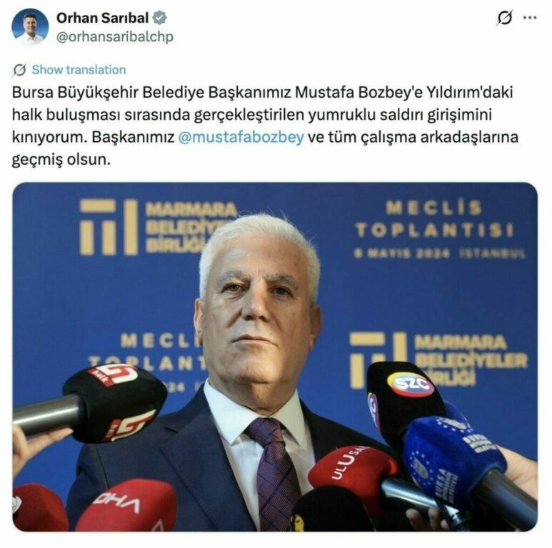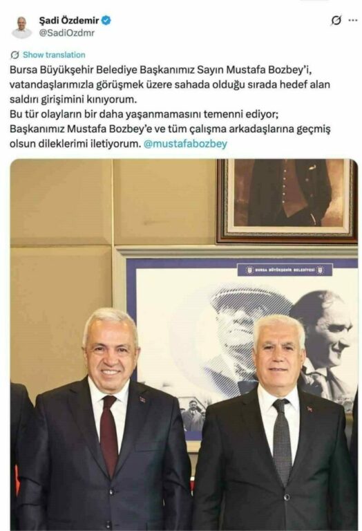 Edinilen bilgiye göre, Bursa Büyükşehir Belediye Başkanı Mustafa Bozbey, “Başkan Bozbey Burada” programı kapsamında Yıldırım ilçesinde vatandaşlarla bir araya geldiği sırada konuşma yaptığı esnada sözlü ve fiziki saldırı girişimiyle karşılaştı. Olayın ardından Başkan Bozbey’e yönelik saldırı girişimi kamuoyunda geniş yankı uyandırırken, Bursalı belediye başkanları ve siyasetçilerden sert tepkiler geldi.