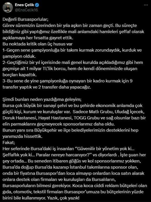 Bursa’daki iş dünyasına çağrıda bulunan Başkan Çelik, “Matlı Grubu, Uludağ İçecek, Doruk Hastanesi, Hayat Hastanesi, Togg Grubu ve birkaç sponsor dışında ciddi destek alamadık. Büyükşehir ve ilçe belediyelerimizin desteğini hep hissettik. Ama şehirdeki iş insanları ’Güvenilir yönetim yok, şeffaflık yok’ diyordu. Artık her şey şeffaf ve ortada. İstanbul kulüplerine milyonlarca lira sponsorluk yapan, onlardan loca alan firmalar Bursaspor’a destek vermiyor. Koca koca gıda, otomotiv ve tekstil firmaları reklam bütçelerinin yüzde birini bile bu şehrin takımına harcamıyor. Yazık, çok yazık” ifadelerini kullandı.
