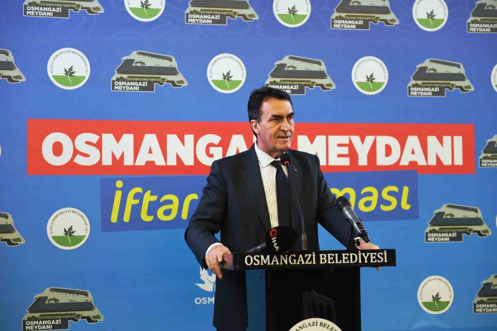 İftar yemeğinin ardından bir konuşma yapan Osmangazi Belediye Başkanı Mustafa Dündar, “Osmangazi’de vatandaşlarımız ile güzel bir Ramazan geçiriyoruz. Osmangazi Belediyemizin 14 yıldır üzerinde çalıştığı önemli bir kentsel dönüşüm projesi olan Osmangazi Meydanı’nda düzenlediğimiz iftar programları ile her akşam farklı kesimlerden vatandaşlarımız ile aynı sofrada buluşuyoruz. Bugün de şehitlerimizin emaneti olan sizlerle bir arada olmaktan dolayı çok mutluyuz. Vatandaşlarımızla iftar yaparak hem Ramazan ayının birlik, beraberlik ve dayanışma ruhunu birlikte yaşıyoruz hem de vatandaşlarımızın yakında açılışını yapacağımız bu devasa meydan hakkındaki meraklarını gidermiş oluyoruz. Bu merakları giderme adına Ramazan öncesinde gençlere yönelik konserler yaptık ve 250 bin gencimizi 37 bin metrekare büyüklüğündeki bu meydanda ağırladık. İki etap halinde çalıştığımız Osmangazi Meydanı projesinin birinci etabını önümüzdeki günlerde hizmete açacağız. İnşallah seçimlerde halkımızın bizlere vereceği destek ile de ikinci etaptaki çalışmalarımız hız kazanacak. Yapılaşmanın yoğun olduğu bir şehirde yaşadığımız için bu tür meydanlara vatandaşlarımız ihtiyaç duyuyordu. Osmangazi Meydanı, Bursa’ya nefes aldıran bir eser olarak ortaya çıktı” dedi.