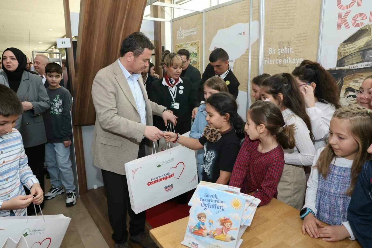 BURSA 23. KİTAP FUARI’NI ZİYARET EDEN OSMANGAZİ BELEDİYE BAŞKANI ERKAN AYDIN, ÇOCUK YAZARLARLA BİR ARAYA GELDİ. OSMANGAZİ BELEDİYESİ’NİN EĞİTİME VE EDEBİYATA VERDİĞİ DESTEĞE İŞARET EDEN BAŞKAN AYDIN, “MUTLAKA BEYNİMİZİ, İÇSEL DÜNYAMIZI VE GELECEĞE HAZIRLANAN ÇOCUKLARIMIZI KİTAPLA EĞİTMEMİZ GEREKİYOR.” DİYE KONUŞTU.