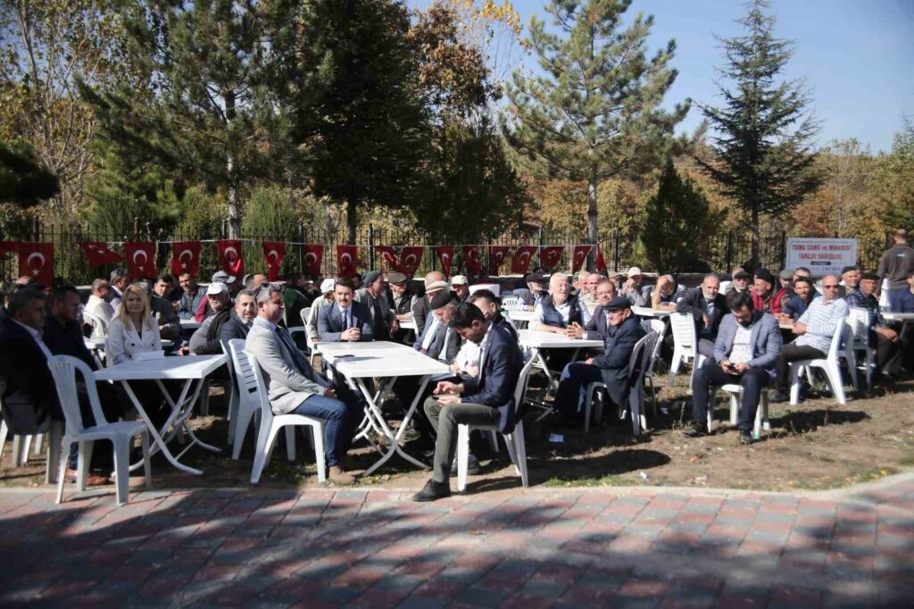 “Yaklaşık 400 yıla yakın bir süredir buralarda ibadet ediliyor” diyen Korkmaz, “Bu beldenin çok güzel bir hikâyesi var; bu mekân kurulduğu günden beri hiçbir Cuma vaktinde, bir Allah dostu gelmeden geçirmemiş. Bugün burada bir minare yapıyoruz. Gerçekten ülkemiz ve dünyamız çok karanlık bir tünelden geçiyor. Yaşananları hepiniz biliyorsunuz. Allah Filistin ve Gazze başta olmak üzere, Doğu Türkistan’da, Arakan’da, Sudan’da, Somali’de dünyanın neresinde zulüm gören bir Müslüman kardeşim varsa yar ve yardımcısı olsun. Bizler sıcak yataklarımızdan çıktık Cuma Pazarı’mıza geldik. Kardeşlerim bugün 6 milyonluk bir terör örgütünün dünyaya kan ve gözyaşı verdiği bir gündeyiz. Müslümanlar olarak rahatsız mıyız? Son derece rahatsızız. Kanımıza dokunmuyor mu? Son derece dokunuyor. İsrail Başbakanı çıkıyor, ‘Mehdi gelecek biz ona göre yaşıyoruz, Mehdi’nin işini kolaylaştıralım’ diyor. Herkes inancının gereğini yapabiliyor. Biz hariç. Kur’an-ı Kerim bize bunları anlatıyor. Hristiyanları, Müslümanları, Medusileri hepsini anlatıyor da, biz anlamıyoruz. Hristiyanlar, Yahudiler Kur’an-ı Kerim’de anlatıldığı gibi ama maalesef Müslümanlar Kur’an-ı Kerim’de anlatıldığı gibi değiller. Bize muasır medeniyetler diye öğrettikleri sözde dünyanın medeni başkanları çıkıp diyor ki, ‘Hastanelerde bunları tedavi etmeye gerek yok, infaz edin” Bunu bir Sağlık Bakanı diyebiliyor. Avrupa Birliği Komisyon Başkanı çıkıp diyor ki, ‘Ateşkes isteyemeyiz’ Daha ne kadar çocuk ölmesi gerekiyor. Bir kere daha gördük ki bu dünyada demokrasi, medeniyet dedikleri her şeyin boş olduğunu. Bu dünyada iki şeyin mücadelesi vardır, birisi hak, biri batıldır. Şunu hiçbir zaman unutmayın, sizinde tuttuğunuz yollar bu iki anayoldan birisine çıkar. Rabbim birliğimizi daim eylesin” diye konuştu.