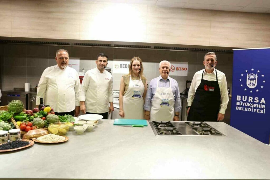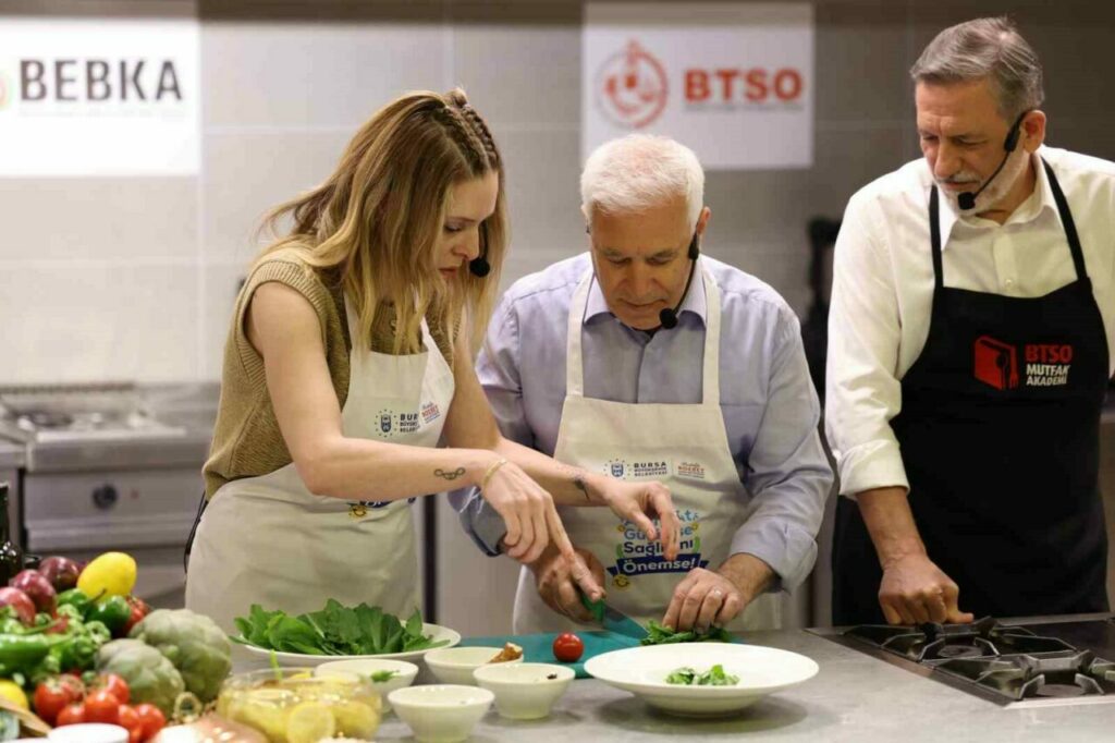 Proje kapsamında Bursa Büyükşehir Belediye Başkanı Mustafa Bozbey ve eşi Seden Bozbey, mutfak önlüklerini takıp BTSO Yönetim Kurulu Başkanı İbrahim Burkay ile birlikte mutfağa girdi. BTSO Mutfak Akademi’de usta şefler Barış Uysal ve Şenol Eralp rehberliğinde, hem lezzetli hem de sağlıklı bir alternatif olan Enginarlı Fit Salata hazırlayan Mustafa Bozbey ve Seden Bozbey, mutfaktaki yetenekleriyle usta şeflerden tam not aldı.