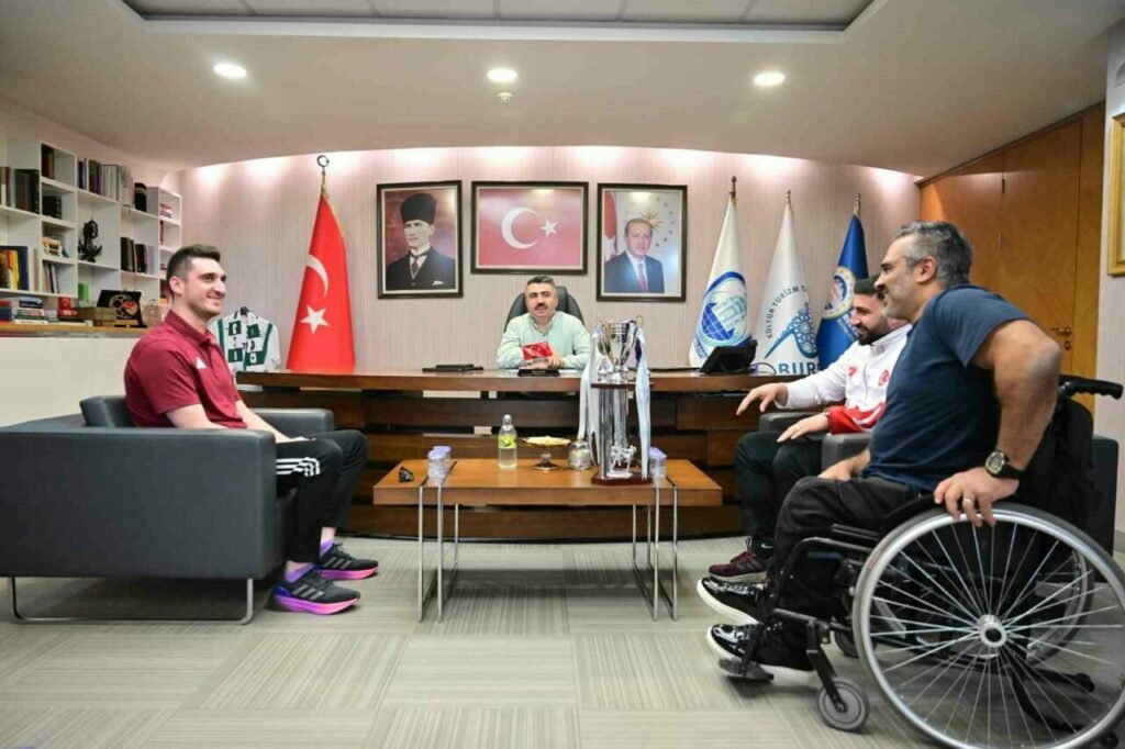 Katıldıkları uluslararası turnuvalarda ülkemizi ve Yıldırımı gururlandıran Toprak Aras, Yusuf İslam Kara, Batın Naniş ve Enes Gezer’i makamında ağırlayan Yıldırım Belediye Başkanı Oktay Yılmaz, başarılı sporcuları tebrik etti. Yıldırım’ın spor kenti kimliğini güçlendirmek için çalıştıklarını vurgulayan Başkan Oktay Yılmaz; “Gerek tesisleşme hamlemiz gerekse de spor kurslarımız ve eğitimlerimizle Yıldırım’ı adeta bir spor kentine çevirdik. Hamdolsun bu yatırımlarımız da meyvelerini veriyor. Sporcularımız katıldıkları ulusal ve uluslararası turnuvalarda ülkemizi ve bizleri gururlandıran önemli başarılara imza atıyorlar. Bu başarılar eminim ki, çocuklarımıza ve gençlerimize ilham olacak bir yol açacaktır. Ben tüm sporcularımızı tebrik ediyor ve başarılarının devamını diliyorum. Spora ve sporcuya olan desteğimiz bundan sonra da artarak devam edecek ifadelerini kullandı.