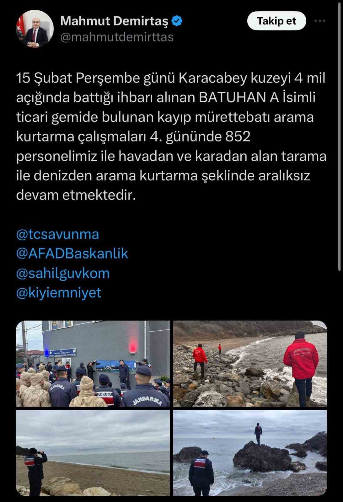 Öte yandan Bursa Valisi Mahmut Demirtaş, sosyal medya hesabından yaptığı paylaşımda, “15 Şubat Perşembe günü Karacabey kuzeyi 4 mil açığında battığı ihbarı alınan Batuhan A isimli ticari gemide bulunan kayıp mürettebatı arama kurtarma çalışmaları 4. gününde 852 personelimizle havadan ve karadan alan tarama, denizden arama kurtarma şeklinde aralıksız devam etmektedir” dedi.