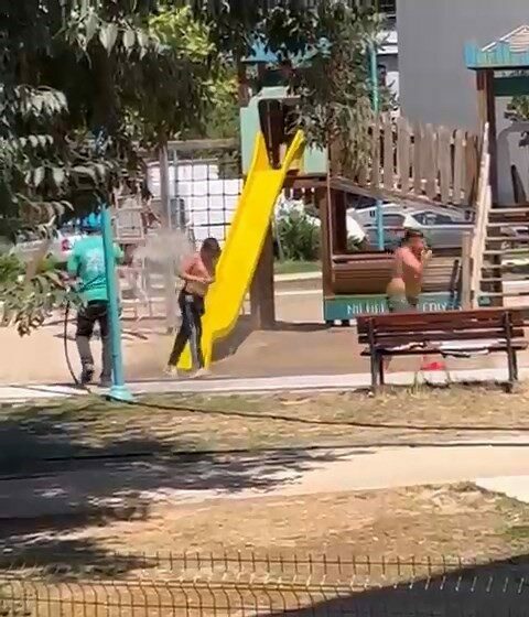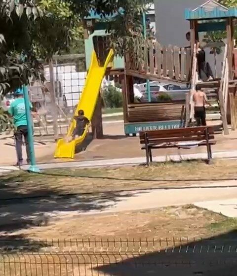 Bursa’da hava sıcaklığı 40 derecenin üzerinde seyretmesi insanları bunalttı. Serinlemek için farklı farklı yöntemlere başvuran vatandaşlar ilginç görüntüler oluşturdu. Nilüfer ilçesindeki bir çocuk pakında kaydıraktan kayan gençler belediye temizlik işçisinin kendilerine doğru tuttuğu hortumun altından dakikalarca ıslanarak kaydı. Bir oto yıkamacıda ise sıcaktan bunalan araç sahibi aracını yıkadığı tazyikli su tabancasını kendine doğru çevirip kendini yıkadı.