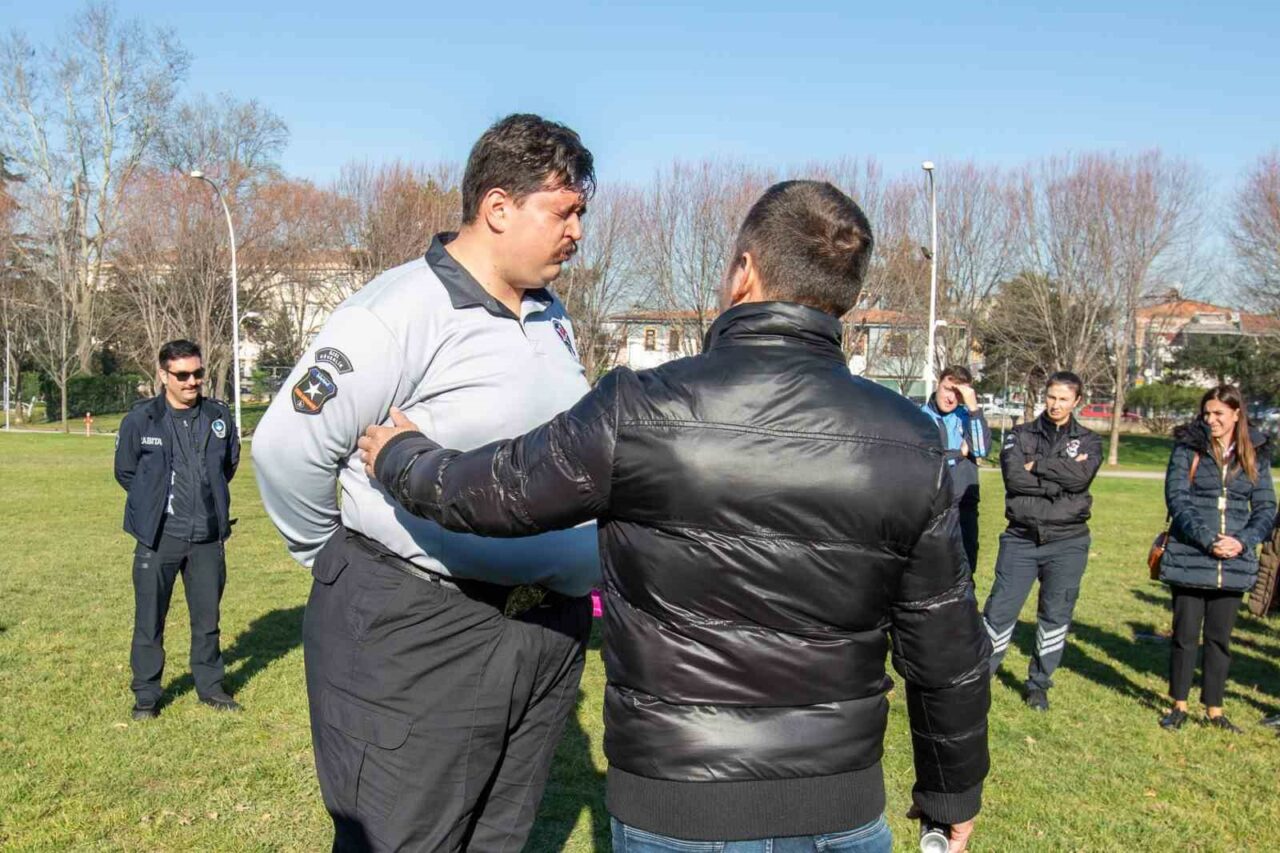 Bursa Büyükşehir Belediyesi’nin açık ve kapalı hizmet alanlarında görevli özel güvenlik personeli, göz yaşartıcı spreyin etkilerini önce kendi gözlerinde hissetti. Teorik eğitimde biber gazının nasıl kullanılacağını öğrenen personel, gazın etkisini ise yüzlerine biber gazı sıkılınca yaşayarak hissetti.