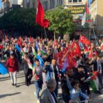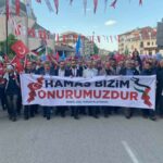 İnegöl Belediyesi eski binası önünde toplanan binlerce kişi “Filistin Yahudi’ye mezar olacak” yazılı dev pankartla Atatürk bulvarı üzerinden Atatürk heykeline kadar yürüdü.