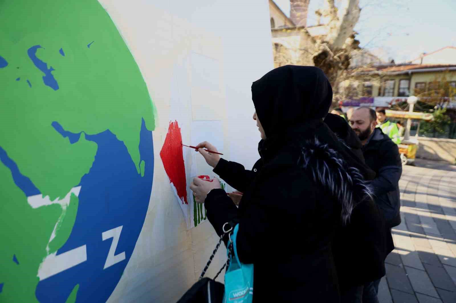 Bursa Büyükşehir Belediyesi, İsrail’in dünyaya aldırmadan Filistin’de sürdürdüğü soykırıma farklı bir çalışmayla dikkat çekti. ‘Uyumayın, susmayın, Gazze’ye sahip çıkın’ temasıyla yapılan etkinlikte, boya fırçalarını ellerine alan Bursalılar dünyaya barış mesajları gönderdi.