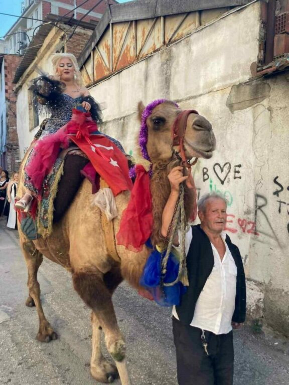 Bursa’da Osmangazi ilçesi Demirtaşpaşa Mahallesi’nde gerçekleşen düğünde, sünnet çocuğu Yamaç Güç, davul zurna ile birlikte Midilli cinsi atla mahalleyi gezdirilirken annesi de ilginç bir şekilde oğluna eşlik etti. Anne Birsen Güç ise adeta düğün arabası gibi süslenen deveyle oğlunun arkasından mahalle turuna eşlik etti. O anlara şahit olan vatandaşlar gözlerine inanamadı