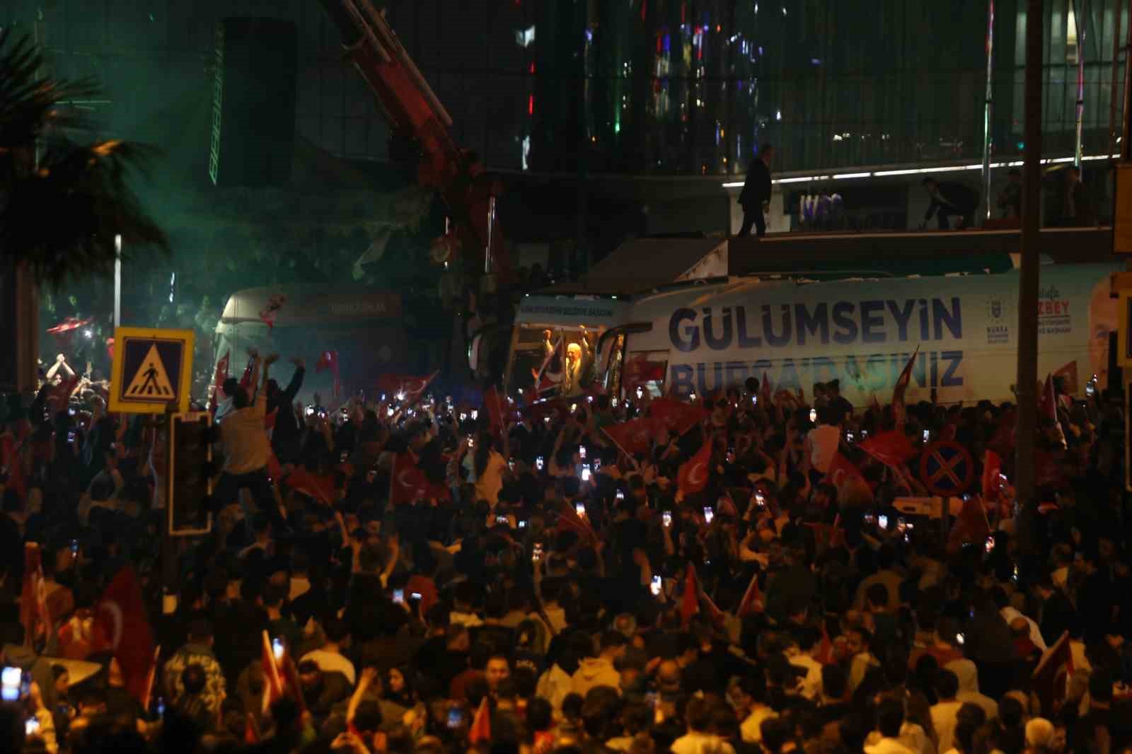 Bursalıların izdiham oluşturduğu alanda büyük bir coşku ve havai fişekler eşliğinde karşılanan Bozbey, seçim otobüsünden Bursalılara seslenerek zafer konuşması yaptı.