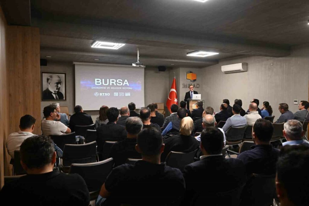 BTSO Yönetim Kurulu Başkanı İbrahim Burkay, İMSİAD üyeleriyle bir araya gelerek “Bursa Ekonomisi ve Gelecek Vizyonu” başlıklı bir sunum gerçekleştirdi. TEKNOSAB Lojistik Park Girişim Sermayesi Yatırım Fonu başta olmak üzere BTSO tarafından yürütülen proje ve çalışmaları İMSİAD üyeleri ile paylaşan Başkan Burkay, inşaat sektörünün sanayi, tarım, turizm ve hizmetler sektörü birlikte sürdürülebilir bir büyümenin önemli bir parçası olduğunun altını çizdi. İMSİAD Başkanı Şeref Demir ve Yönetim Kurulu Üyelerinin ev sahipliğinde gerçekleşen programa, BTSO Yönetim Kurulu üyeleri ve çok sayıda İMSİAD üyesi katıldı.